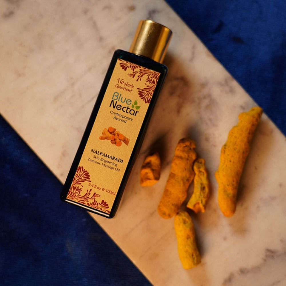 Curious about achieving naturally radiant skin? If you’ve ever listened to your grandmother’s skincare wisdom, you’ll know that turmeric likely tops her list of essentials. Blue Nectar Nalpamaradi Thailam with turmeric is a traditional Ayurvedic oil crafted using Grandma’s cherished recipe. Truly a gift from nature, this body oil is a blend of 16 Ayurvedic herbs including turmeric, sesame oil, and rakta Chandana. These natural active components are celebrated for their antioxidant and healing properties, aiding in nourishment and hydration naturally. Nalpamaradi Thailam assists in skin repair, diminishes uneven skin tone, and reduces pigmentation. It also serves as a detan oil by enhancing complexion and minimizing tanning.