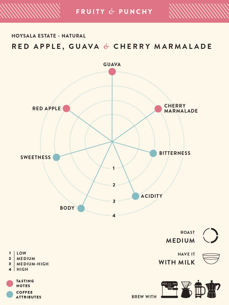 - Indulge in the vibrant essence of tropical fruits with every sip of this medium roast coffee. These beans, skillfully processed using the natural technique, offer a delightful taste profile featuring juicy red apples, guava, and cherry marmalade. The bright acidity harmonizes with its smooth, rounded body, delivering a syrupy texture. The experience concludes with a persistent, silky chocolate aftertaste.