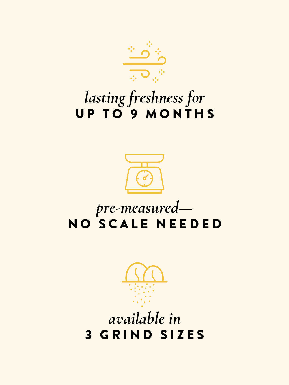 - Offered as whole beans or pre-ground coffee to suit your specific brewing equipment