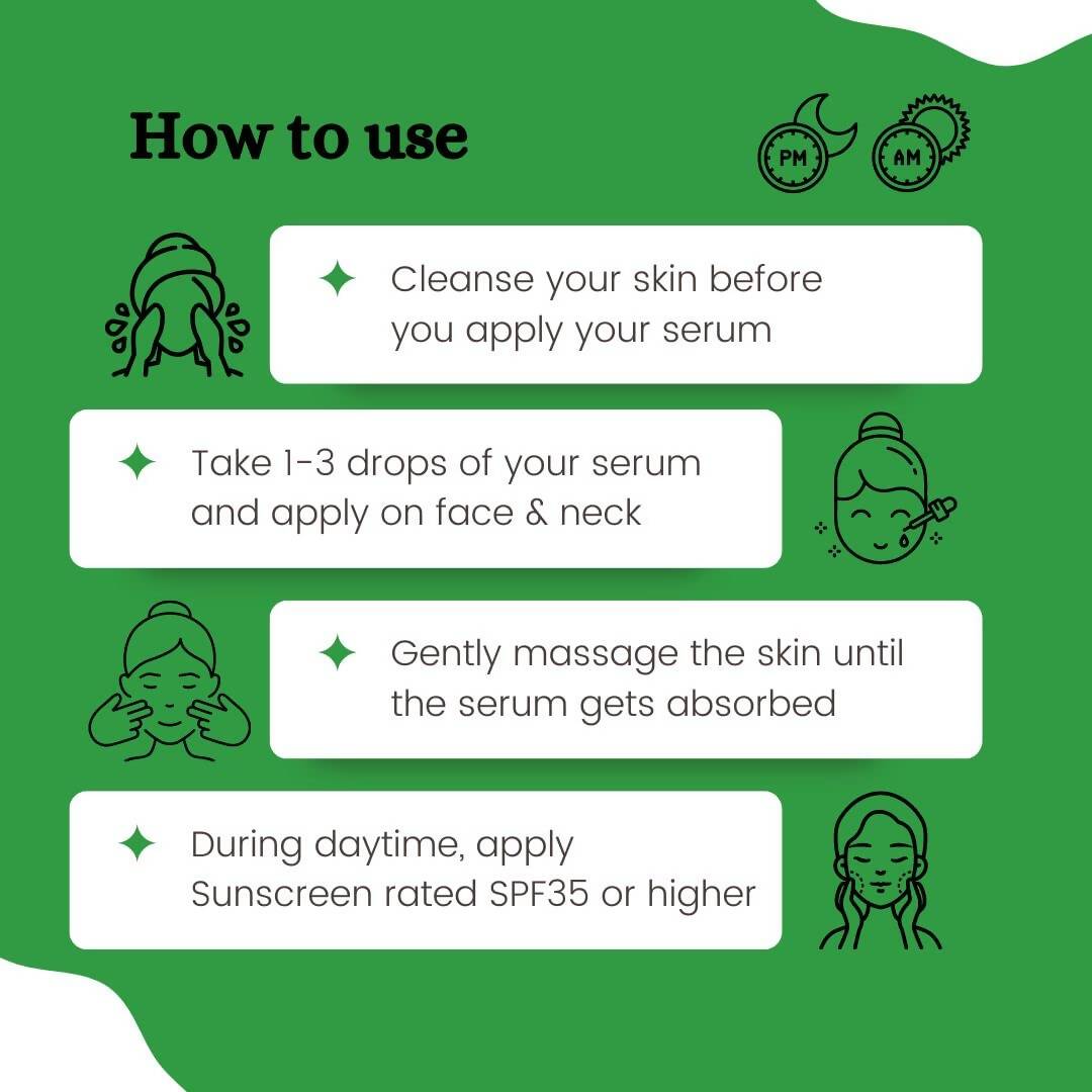 - Dispense 1-3 drops of the serum onto your cleansed & dry face.