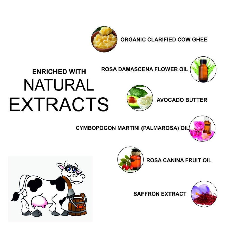 Rejuvenate & Revive Your Skin: A perfect fusion of skin-enriching components such as Avocado butter, Saffron flower extract, Rosa damascena flower oil, Mango Seed Butter, Beeswax pellets, Clove flower oil, Rosa canina fruit oil, and other natural extracts revitalizes your skin. It deeply nourishes, hydrates, and invigorates tired skin, leaving it more radiant and revitalized.