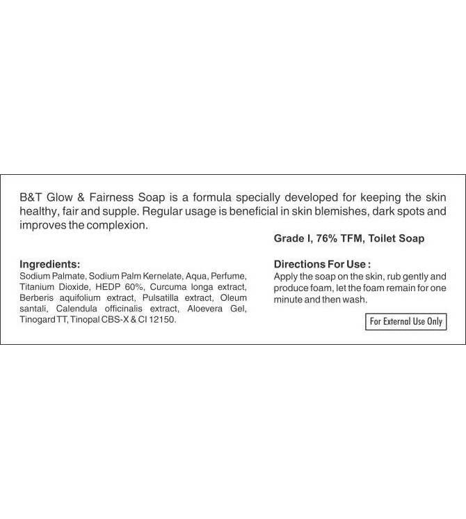 B&T Glow & Fairness Soap is expertly crafted to maintain the skin's vitality and softness. Consistent use is advantageous for addressing skin imperfections.How to use: