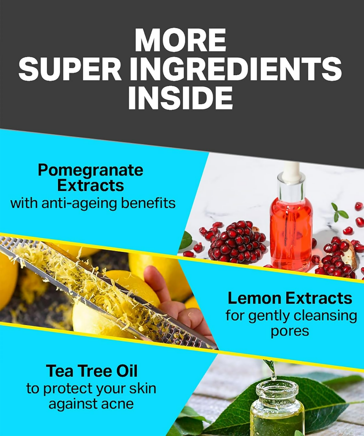 - Charcoal, Tea Tree Oil, Pomegranate, Lemon Extracts