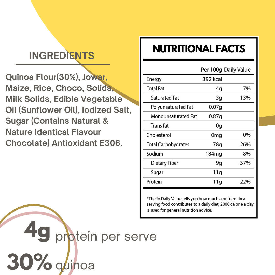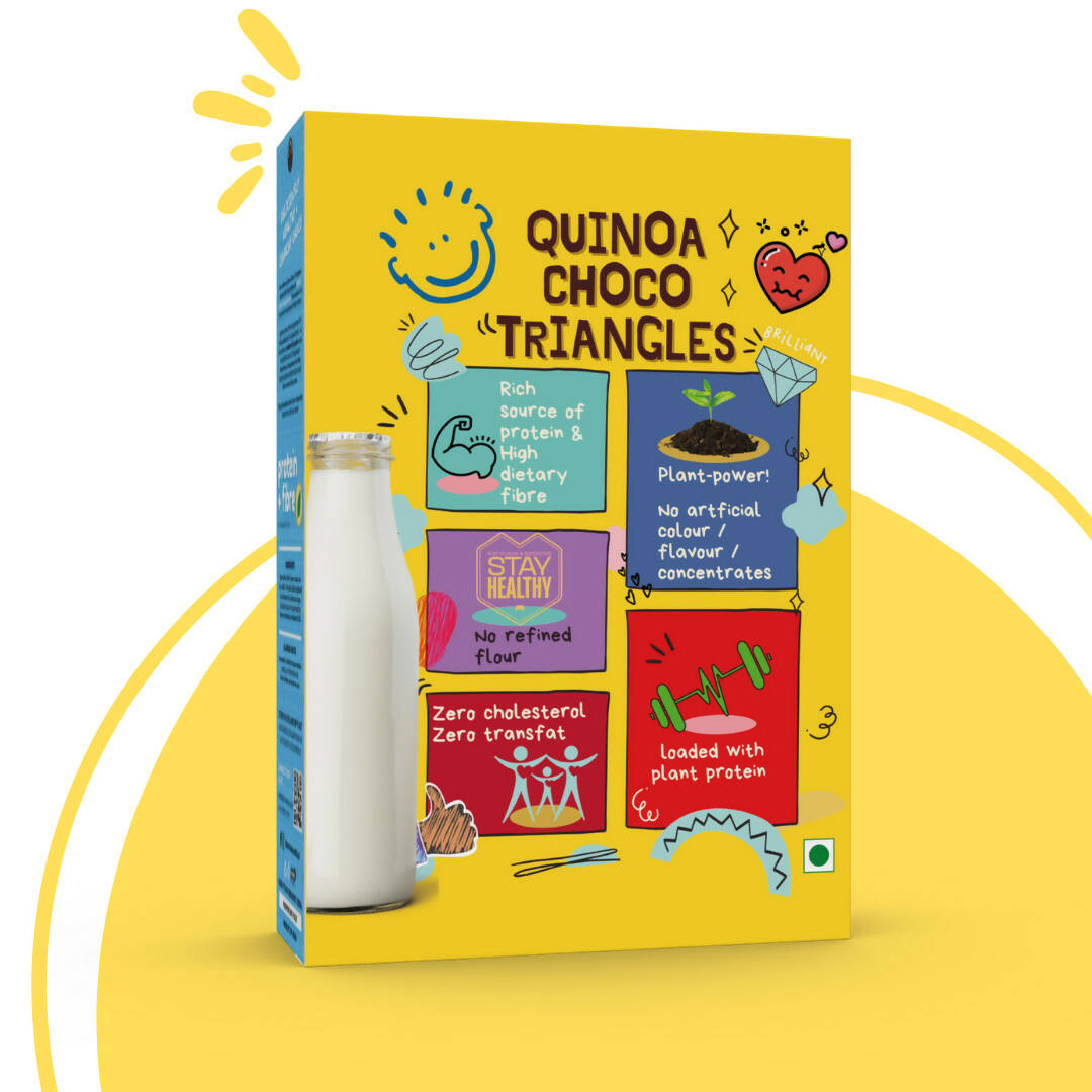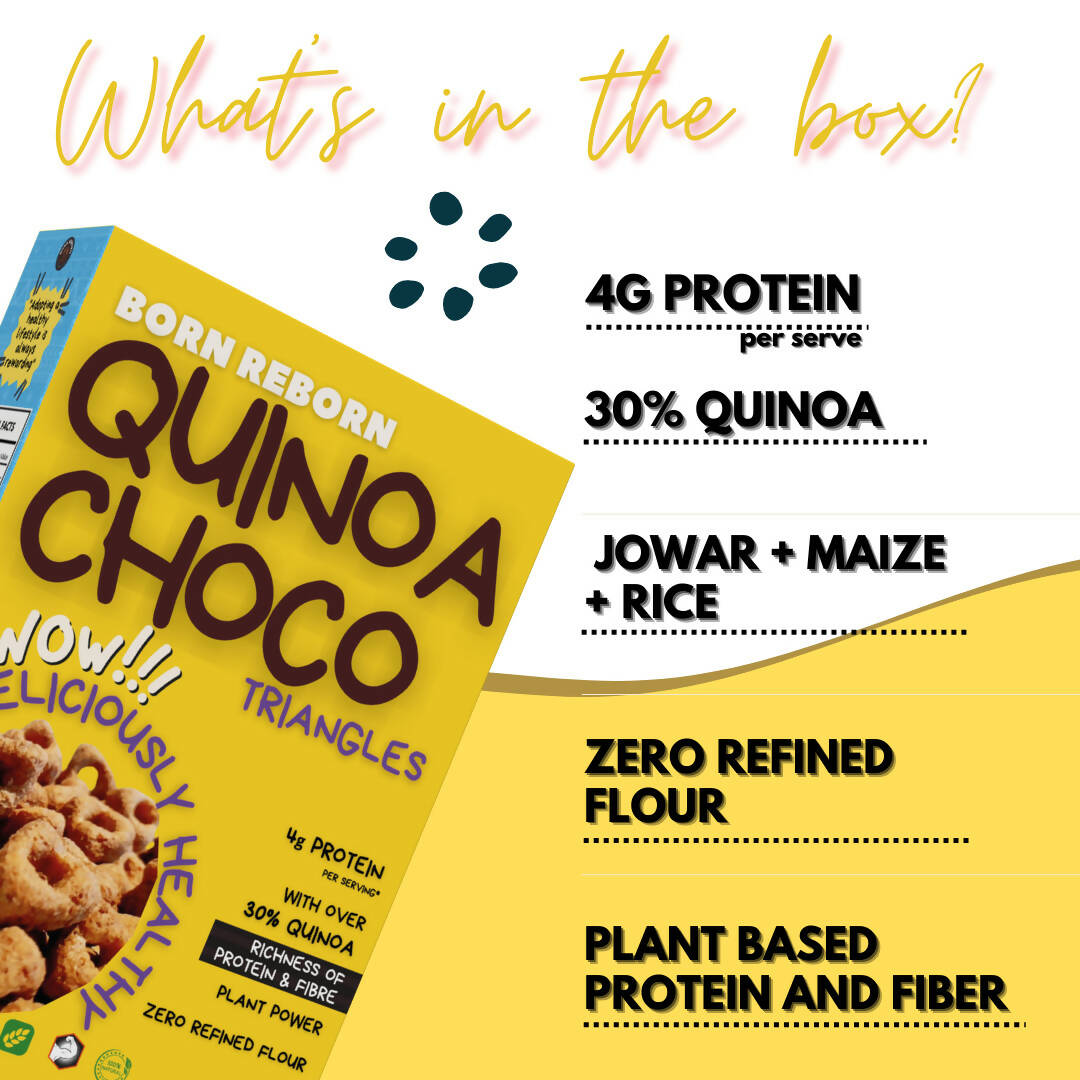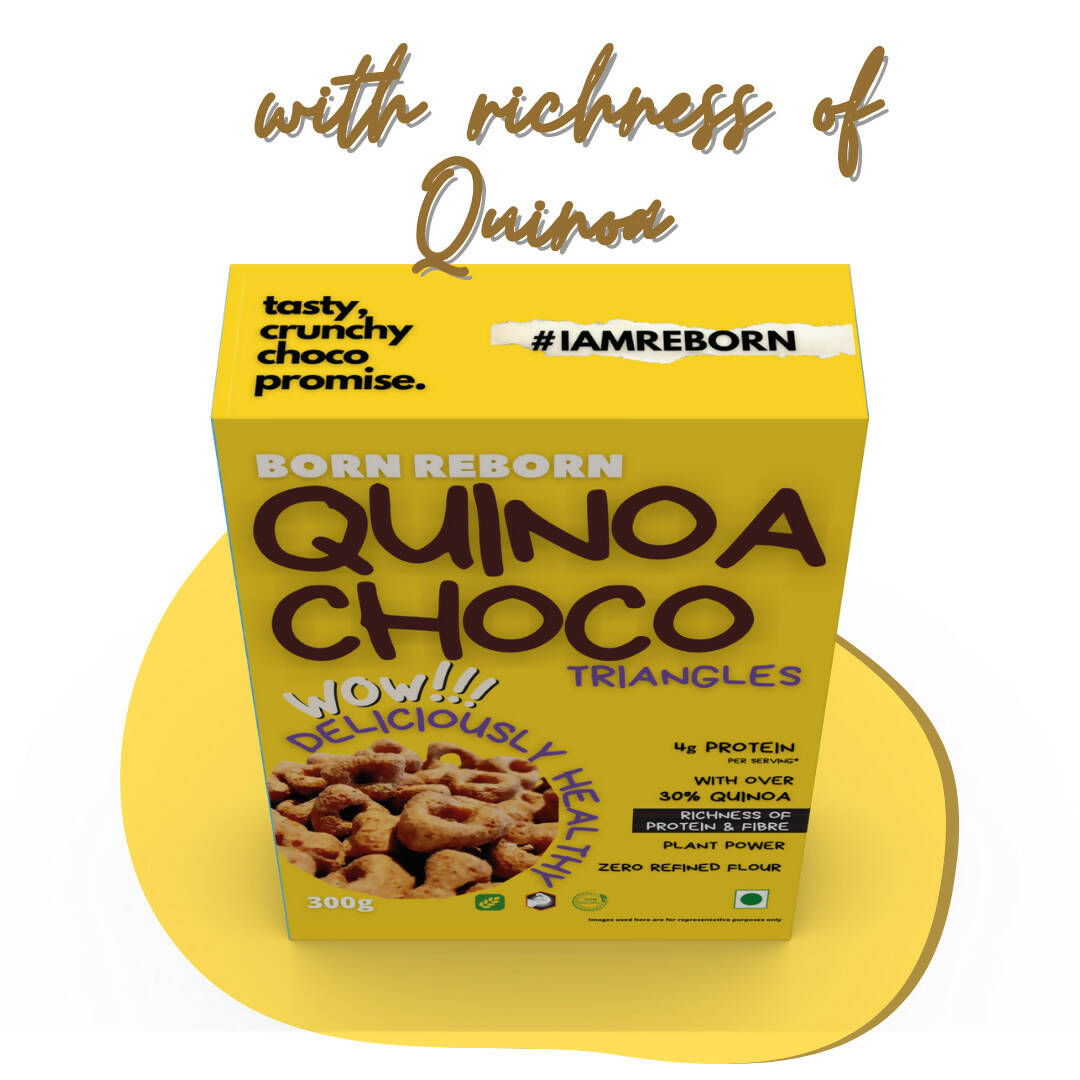 "BORN REBORN Quinoa Choco Triangles offer a delightful and nourishing breakfast cereal that appeals to both kids and adults. Crafted with premium quinoa, this cereal is rich in vital nutrients and wellness benefits. It is free from artificial preservatives and colors, making it an excellent option for those with dietary preferences or allergies. The chocolate taste of Quinoa Choco is utterly tempting, made with the highest quality cocoa powder. Whether relished with milk, yogurt, or on its own, Quinoa Choco provides a delectable and fulfilling start to your day."