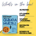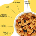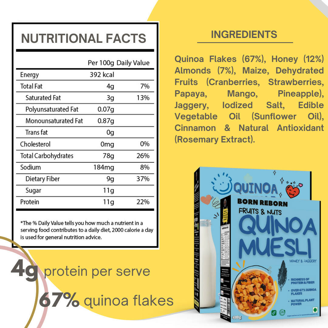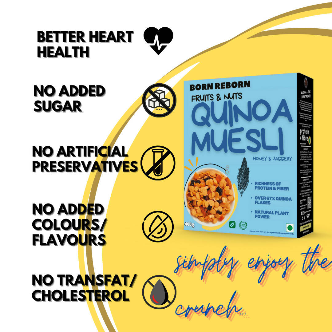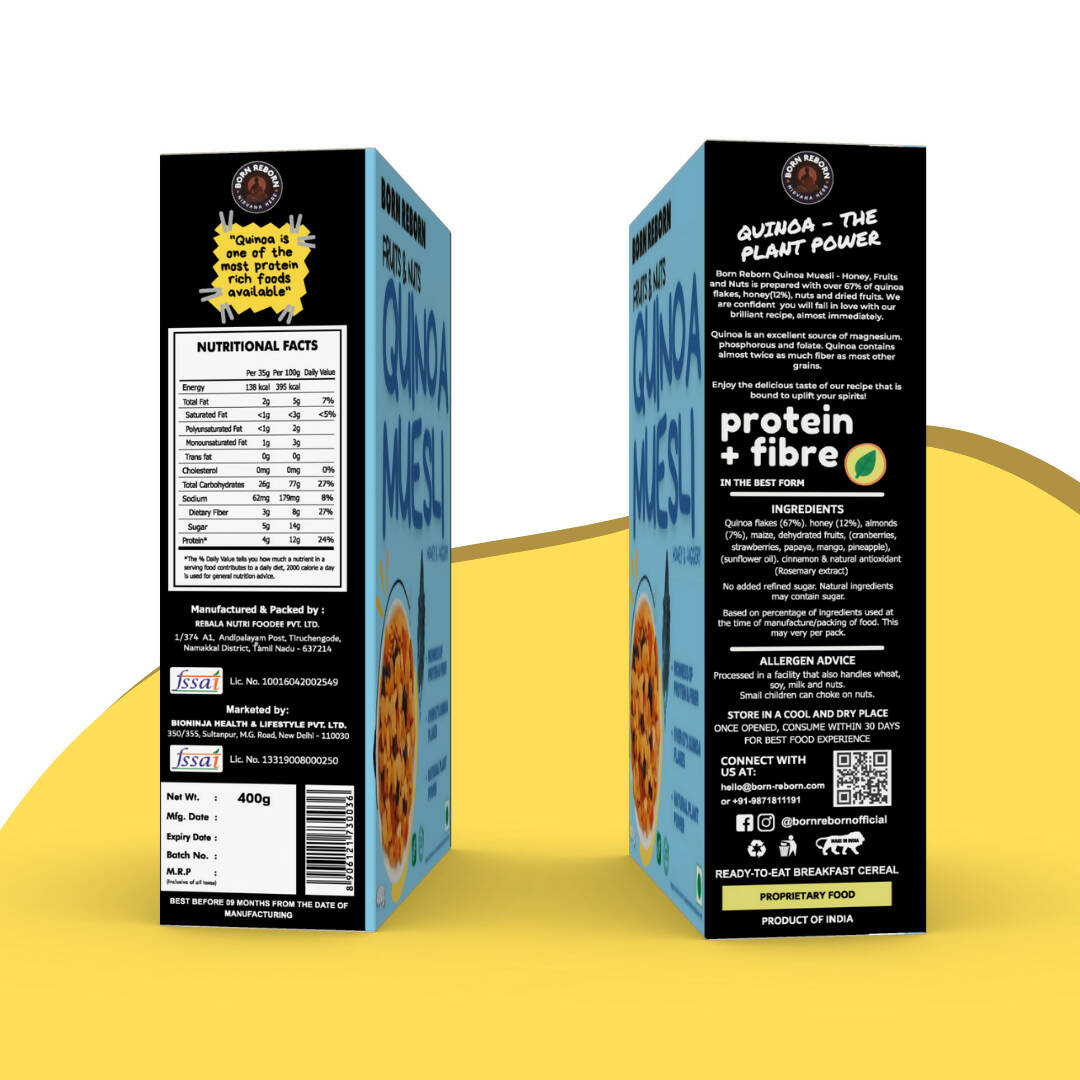 "BORN REBORN Quinoa Muesli with Honey Fruits and Nuts is a tasty and nutritious breakfast option crafted from a distinctive mix of quinoa, jaggery, honey, nuts, and dried fruits. It serves as an excellent source of protein, fiber, and vital nutrients, without any added preservatives, colors, or artificial flavors, making it a healthier alternative to conventional breakfast cereals. The robust taste of quinoa, nuts, and fruits is exquisitely balanced by the natural sweetness of jaggery and honey, offering a delightful and nourishing start to your morning."