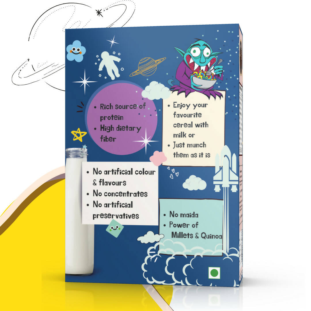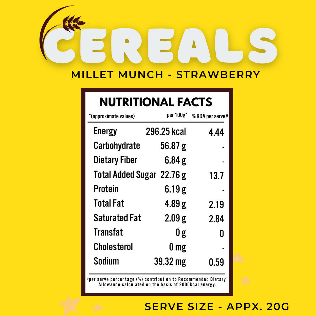 BORN REBORN Millet Munch Milkyway Crunch - Strawberry is a wholesome and flavorful breakfast cereal sure to win the hearts of children. Crafted from a distinctive combination of jowar, quinoa, rice, and unrefined sugar, it delivers a substantial source of protein, fiber, and vital nutrients for your young ones. Unlike conventional kids' breakfast cereals, our Millet Munch Milkyway Crunch - Strawberry is free from artificial flavors and preservatives, with the natural sweetness of unrefined sugar complemented by genuine strawberry flavor and beetroot powder, making it a healthier choice. Its Milkyway-inspired shapes and delightful strawberry taste offer a playful and enticing option for children. Experience it today and provide your kids with a breakfast cereal that's both nourishing and delectable.