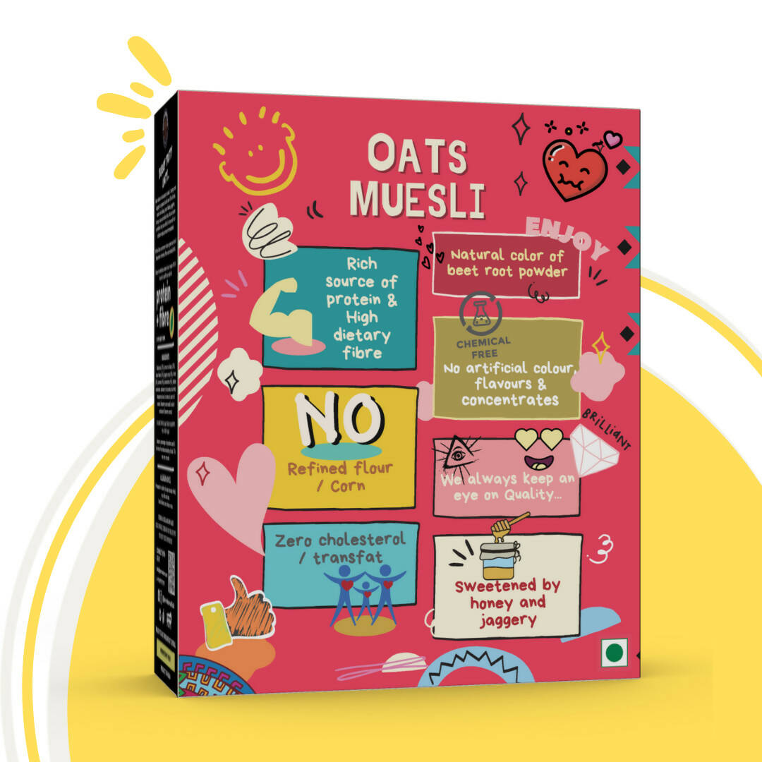 BORN REBORN Oats and Millet Muesli - Strawberry offers a wholesome and delectable breakfast choice crafted from a distinctive mix of rolled oats, brown rice flakes, jowar flakes, jaggery syrup, honey, nuts, and dried fruits. This muesli serves as an excellent source of fiber, protein, and vital nutrients, free from any added preservatives or artificial flavors. The infusion of strawberry essence, combined with the assortment of nuts and dried fruits, provides a unique flavor and texture that will keep you coming back for more. Utilizing jaggery syrup and honey as natural sweeteners, this muesli presents a healthier alternative to conventional breakfast cereals. BORN REBORN is committed to offering premium, nutritious breakfast choices that are both wholesome and appetizing.