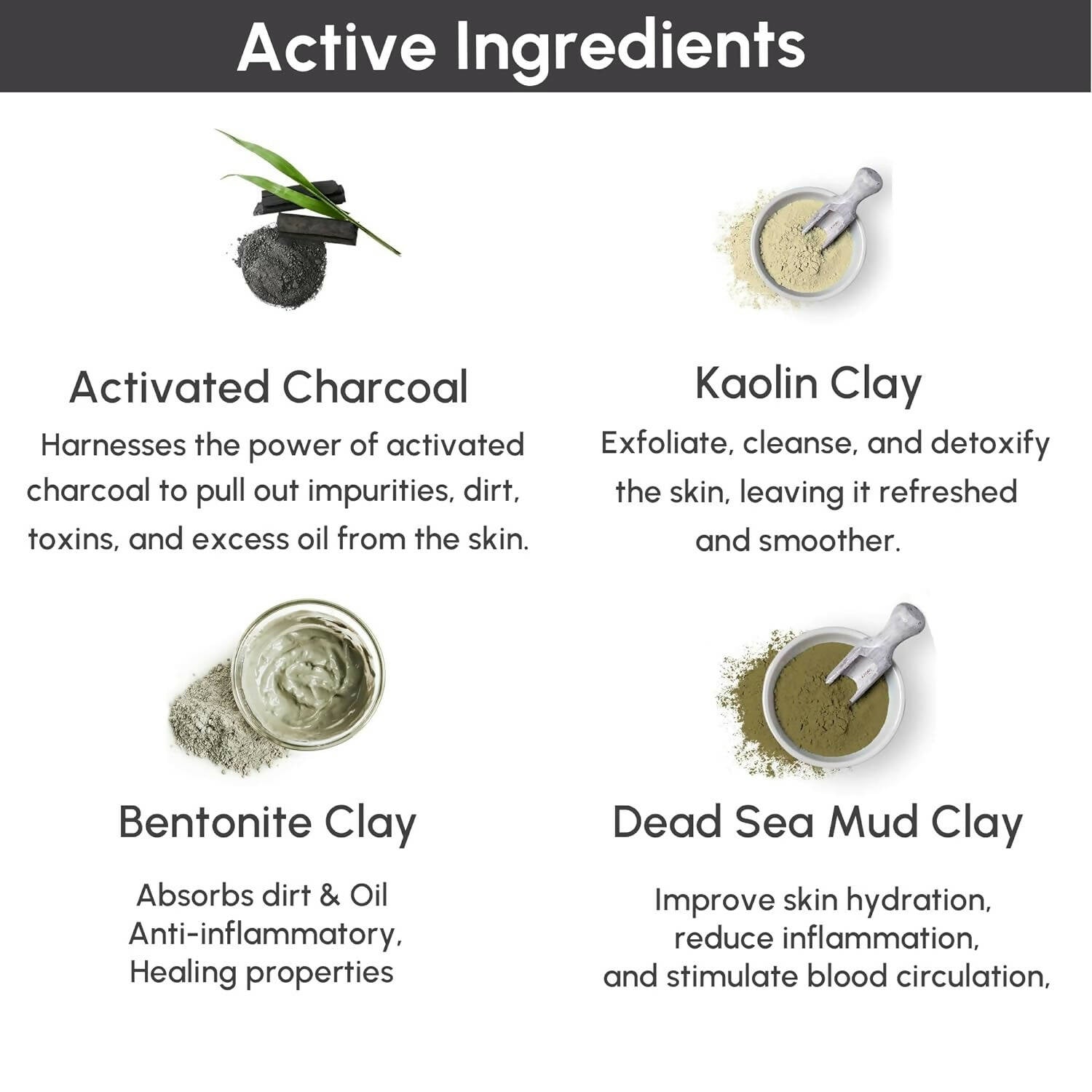 - Natural Mud Clay, Activated charcoal, Kaolin clay, Jojoba oil, olive oil, tea tree oil, and Neem Oil.