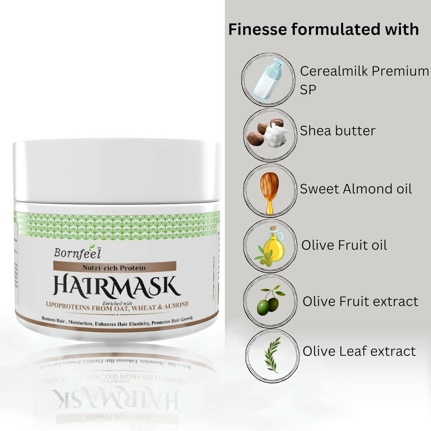 - Protein-Powered: Bornfeel Nutri-Rich Protein Hair Mask offers a remedy for dry, frizzy, and damaged hair. It is enhanced with Cerealmilk Premium SP for nourishment akin to a salon experience.
