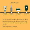- Apply both in the morning and evening. After cleansing and toning, take a few drops of essence in the palm of your hand or on a soft cotton pad, and gently pat over your face and neck.