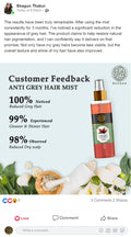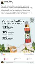 About the Product:As we age, our hair may begin to fade from its original hue and turn gray. While some people embrace their silver strands, others prefer to preserve their natural hair color. This anti-grey hair mist features natural components such as rose petals, hibiscus roselle flower, Himalayan spring water, and fenugreek seeds, which are known to support healthy hair growth and enhance melanin production. By applying this anti-grey hair mist, you can deter or decelerate the graying process, encourage robust hair growth, and utilize natural ingredients. Additionally, this anti-grey hair mist is remarkably simple to apply.