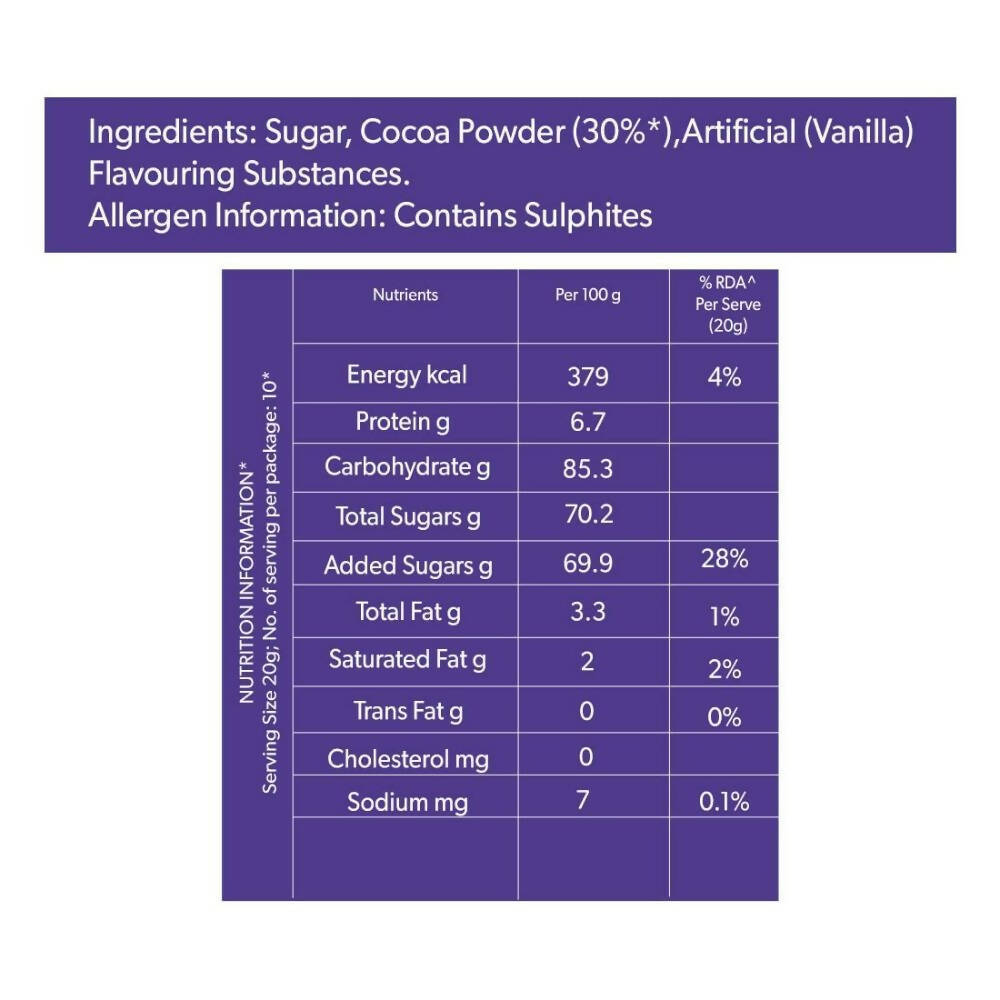 About the Product:Cadbury presents a Hot Chocolate Powder mix to easily enjoy the Cadbury taste in an instant! Offering a smooth and chocolatey taste & experience that is a joy to every tongue. when made with milk, Cadbury Chocolate Drink has a warming, comforting and uplifting effect any time of the day! Stir 2 heaped teaspoons (20g) of Hot Chocolate Powder mix in a cup of hot or cold milk Cadburys Drinking Chocolate is the perfect way to make milk enjoyable for your children.