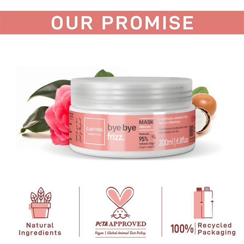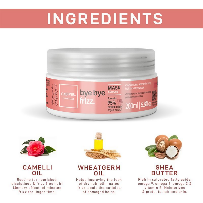 About the product:The Cadiveu Bye Bye Frizz Mask effectively controls frizz, provides hydration, and imparts an exceptional shine to hair. Tailored for professionals, Cadiveu Essentials transforms unruly hair into strands that feel silky, smooth, and look vibrantly healthy with the Bye Bye Frizz Mask. The formula, enriched with natural camellia oil, penetrates the hair shaft, offering deep nourishment, sealing cuticles, and delivering outstanding shine.