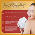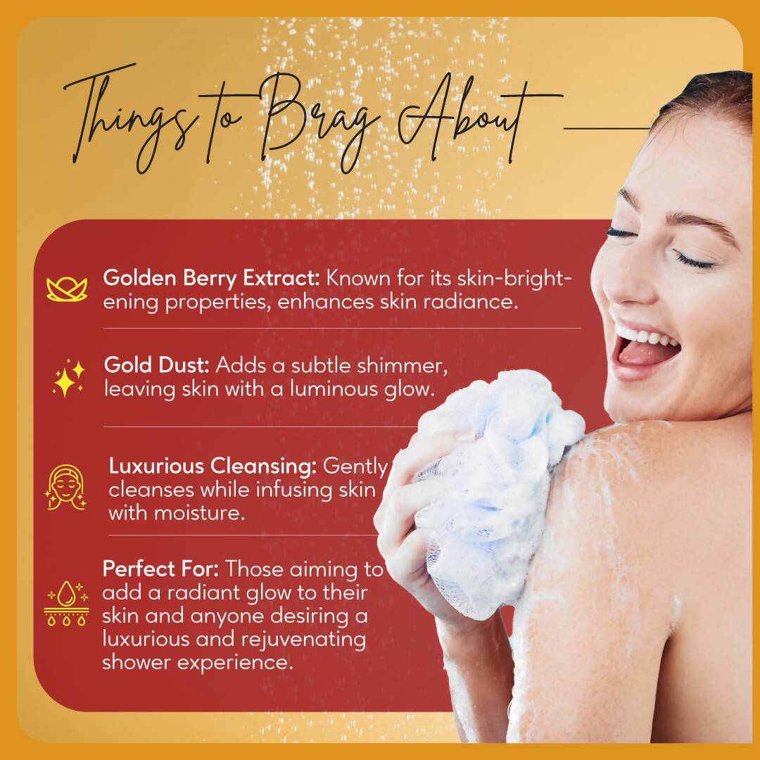 Luxurious Lather: Delight in the magic with our Golden Berry & Gold Dust Brightening Body Wash. Apply a generous amount onto your damp loofah, allow it to caress your skin, and indulge in its opulent lather.