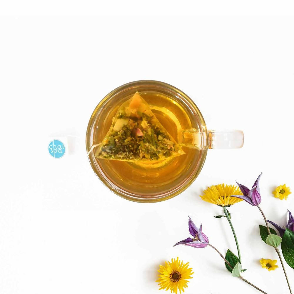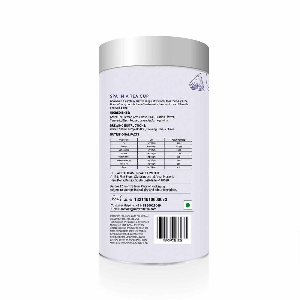 Indulge in a soothing cup of green tea blended with passionflower rose and ashwagandha, perfect for alleviating stress and anxiety.