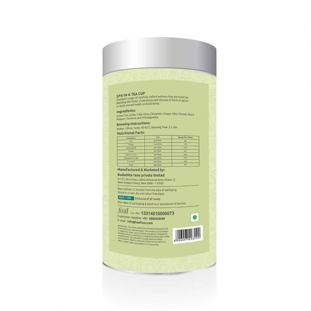 - Green tea, Amla, Tulsi, Giloy, Cinnamon, Ginger, Mint, Fennel, Black pepper, Turmeric, Ashwagandha.