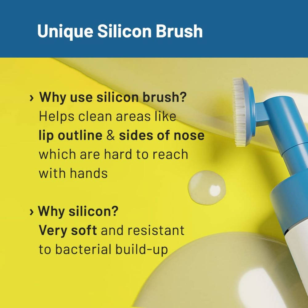 - Moisten your face and neck with water. Dispense the foaming face wash and gently massage across your face and neck using the integrated soft brush to eliminate impurities.