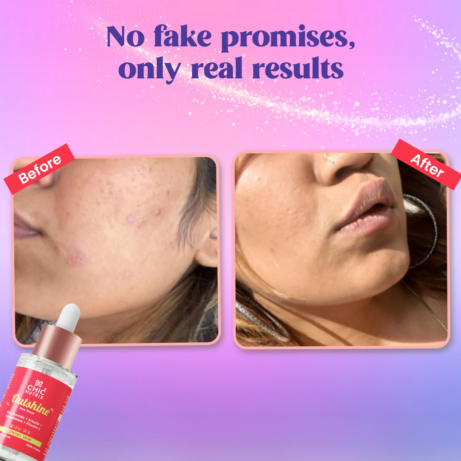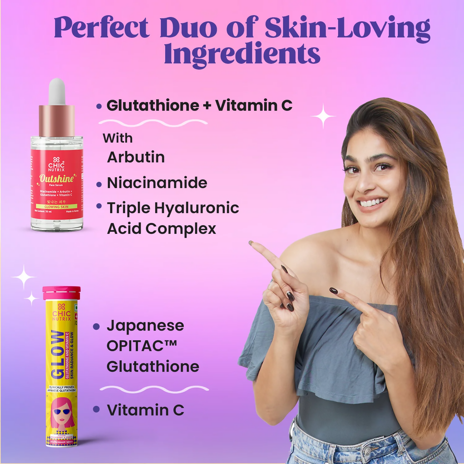 - Chicnutrix Outshine - glutathione + vitamin C Korean brightening serum is specially sourced from Korea and tailored for Indian skin. It offers additional benefits of niacinamide, arbutin, and a triple hyaluronic acid complex to achieve soothing, supple, and hydrated skin. When combined, the glutathione supplement and the brightening serum complement each other to amplify their respective benefits. The supplement acts internally to inhibit melanin production, combat pigmentation, and improve overall skin health from the inside, while the serum provides targeted, external support to diminish dark spots and enhance your skin's glow. It is dermatologist-approved and suitable for all skin types.