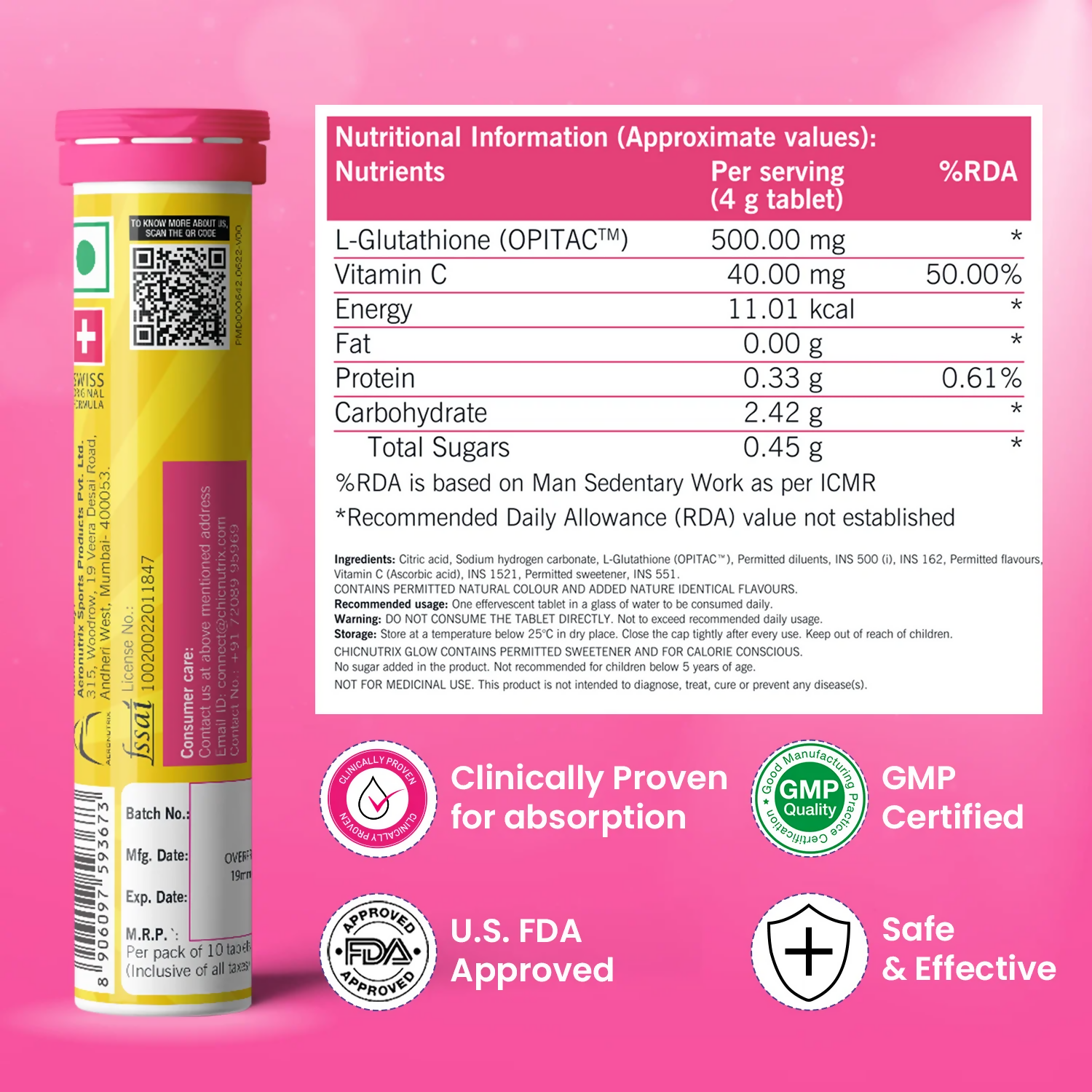 - Embrace your Glow with Chicnutrix Glow, crafted using Swiss Effervescent Technology and enriched with clinically validated Japanese Glutathione for radiant skin alongside Vitamin C. This ideal combination aids in diminishing dark spots & pigmentation, promotes an even skin tone, and enhances your skin's radiance.
