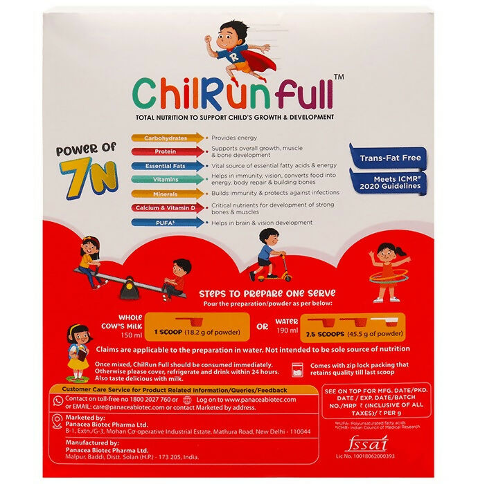 - Chilrun Full Powder is a supplement for your kid 2 years and above. It is designed to supplement the nutritional needs of your children and help support their growth and development. The Key Nutrients include carbohydrates, protein, fat, vitamins, minerals, FOS and other nutrients (choline, arginine, taurine, l-carnitine, inositol) which exemplify the power of 7N. This drink is also available in vanilla, chocolate, mango and kesar badam Flavors.
