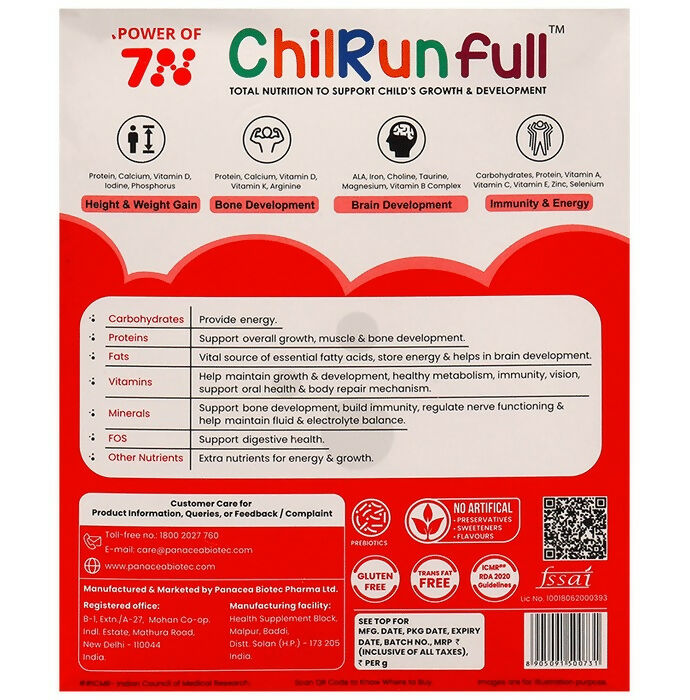 - Chilrun Full Powder is a supplement for your kid 2 years and above. It is designed to supplement the nutritional needs of your children and help support their growth and development. The Key Nutrients include carbohydrates, protein, fat, vitamins, minerals, FOS and other nutrients (choline, arginine, taurine, l-carnitine, inositol) which exemplify the power of 7N. This drink is also available in vanilla, chocolate, mango and kesar badam Flavors