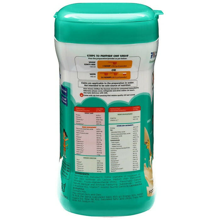 - For Consumption in Milk: Add 1 scoop (18.2 gm) of ChilRun No Sucrose drink powder to 150 ml of whole cow’s milk