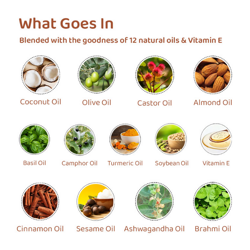 - Helianthus annuus (Sunflower) oil, Ricinus communis (Castor) Seed Oil, Sesamum Indicum (Sesame) Seed Oil, Cocus Nucifera (Coconut) oil, Olea europaea (Olive) Fruit Oil, Prunus Amygdalus Dulcis (Sweet Almond) Oil, Glyceryl Caprylate, Glyceryl Undecylenate, Vitamin E, Withania somnifera (Ashwagandha)Root Oil, Curcuma Longa (Turmeric) Root Oil, Cinnamomum camphora (Camphor) Bark Oil, Bacopa monniera (Brahmi) Leaf Oil, Ocimum Basilicum (Basil) Oil, Cinnamomum zeylanicum (Cinnamon) bark Oil