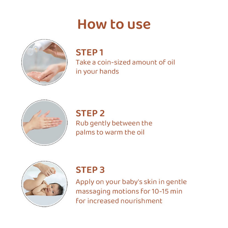 - Dispense the oil onto your palms and gently apply it to the baby’s skin. Massage thoroughly until the oil is absorbed.