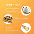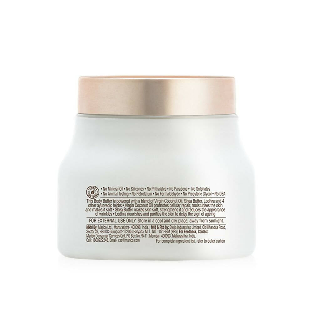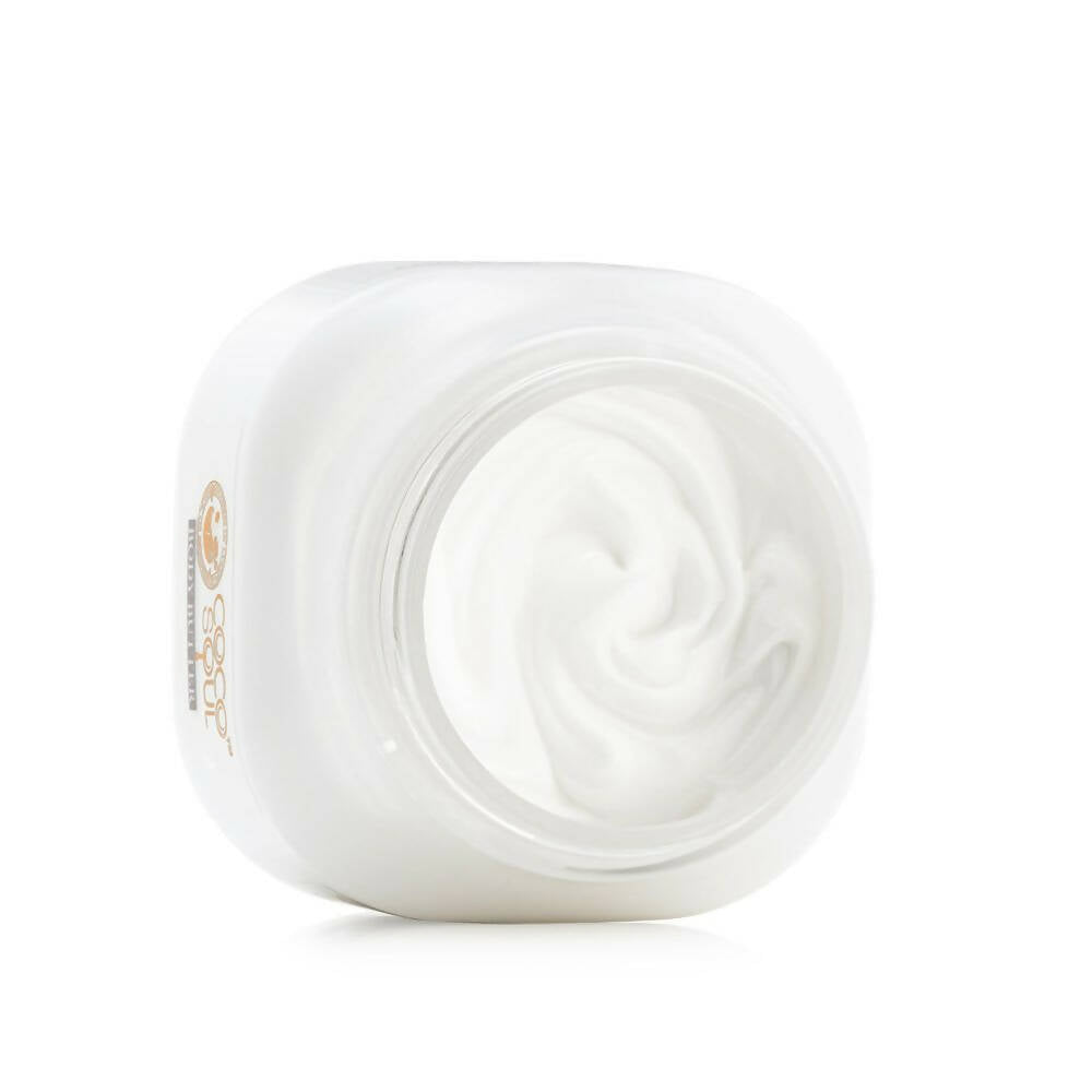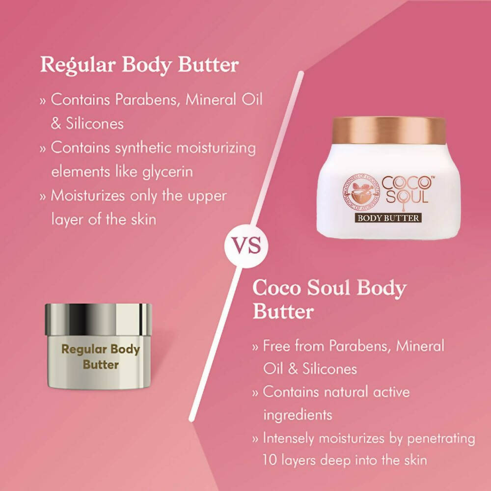 About the product:Coco Soul body butter cream is formulated with the time-honored wisdom of Ayurveda, enriched by the virtues of Virgin King Coconut Oil, and the charm of organic Shea Butter and Lodhra! This lavishly nourishing body butter cream from Coco Soul is a superfood for your skin. It is exceptionally luxurious, light as air, and teeming with antioxidants. What's more? It has a heavenly scent and performs wonders. This natural body butter cream, designed for women, is crafted with organic virgin king coconut oil and precious herbs. Incorporate it into your daily routine to achieve nourished and youthful-looking skin.