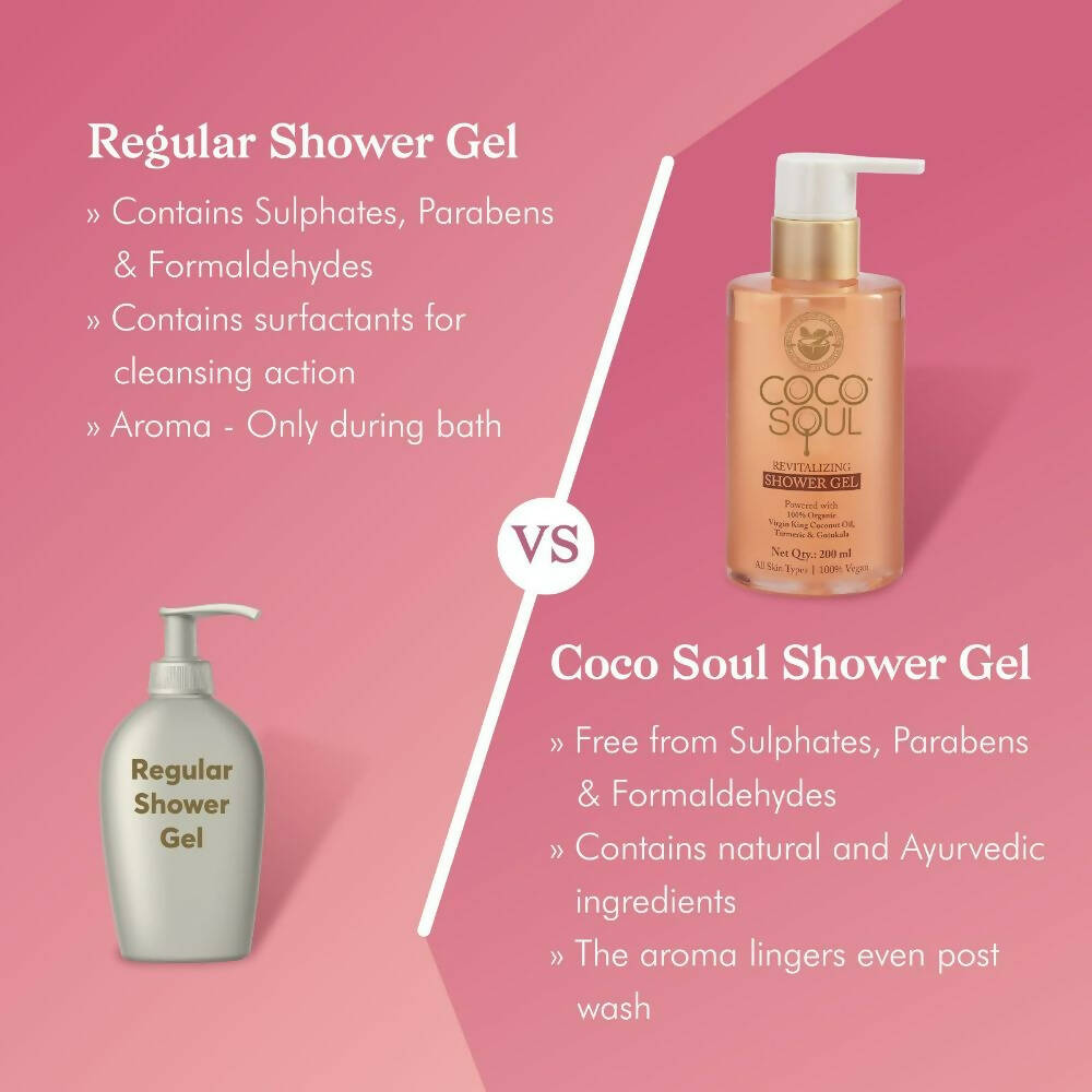 About the product:Experience the Coco Soul Shower Gel, infused with the timeless principles of Ayurveda, enriched with the purity of Virgin King Coconut Oil, and enhanced by the wonders of Turmeric and Gotukola! Formulated with organic virgin king coconut oil and a blend of powerful herbs, Coco Soul's Revitalizing Shower Gel gently cleanses, detoxifies, and invigorates tired skin. The included herbs thoroughly purify your skin without leaving it dry. This natural shower gel not only emits a refreshing scent but its silky consistency also evolves into a rich lather, making it perfect for daily use.