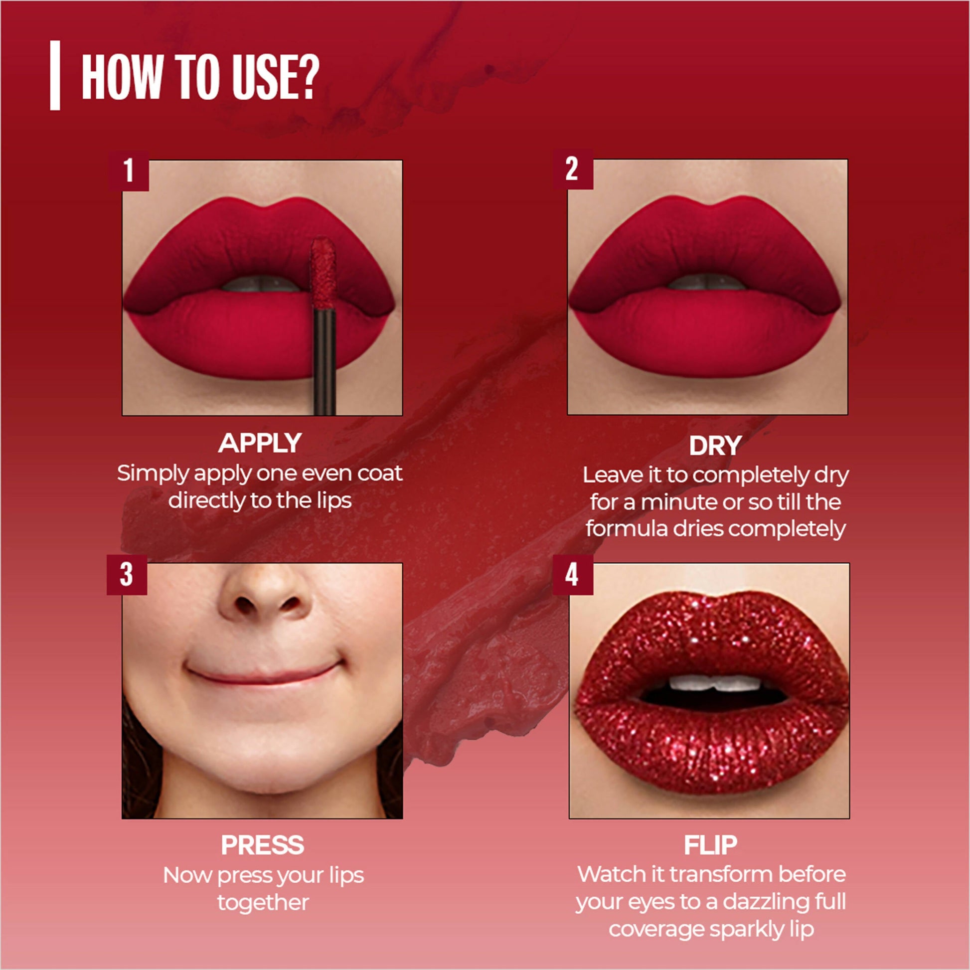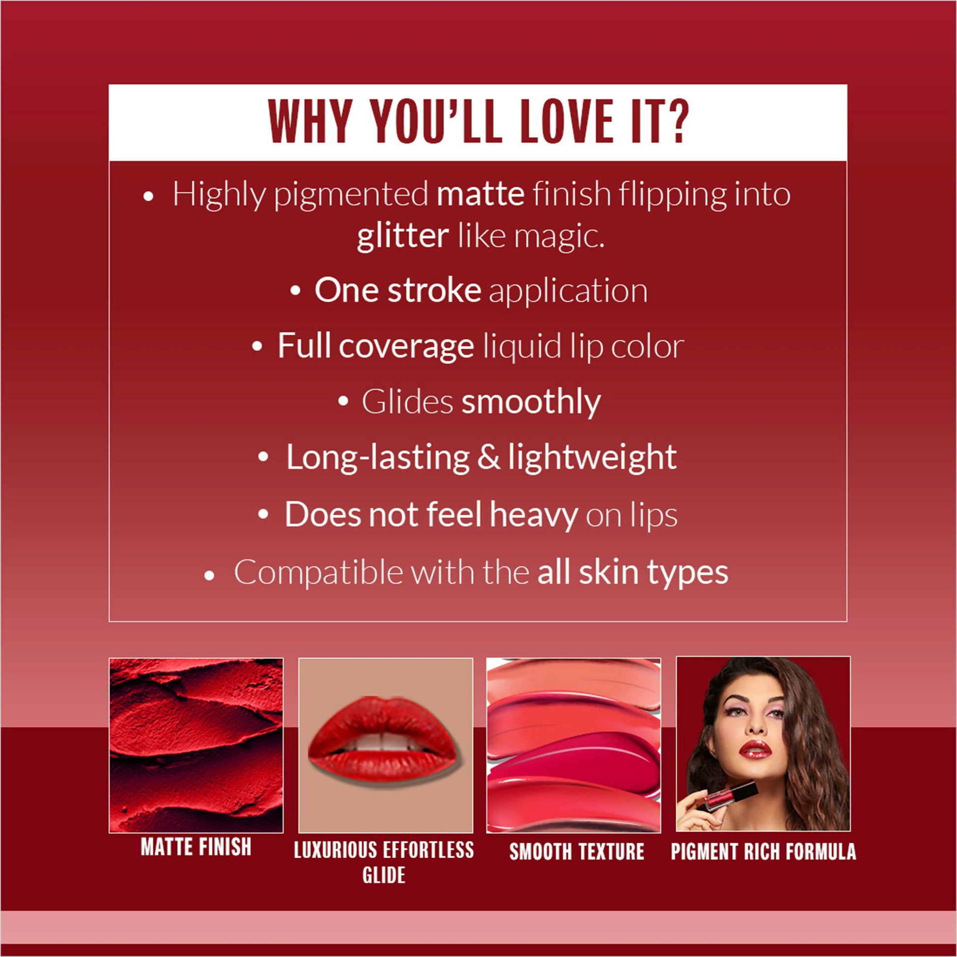 - Press coated lips together to magically transform this matte liquid lipstick into a shimmering glitter lip, unveiling a progressively sparkling finish as you move! Bold finishes: choose from opaque, vibrant matte glamour or color that radiates with otherworldly pearl and sparkle infusions. Contents made in Italy.
