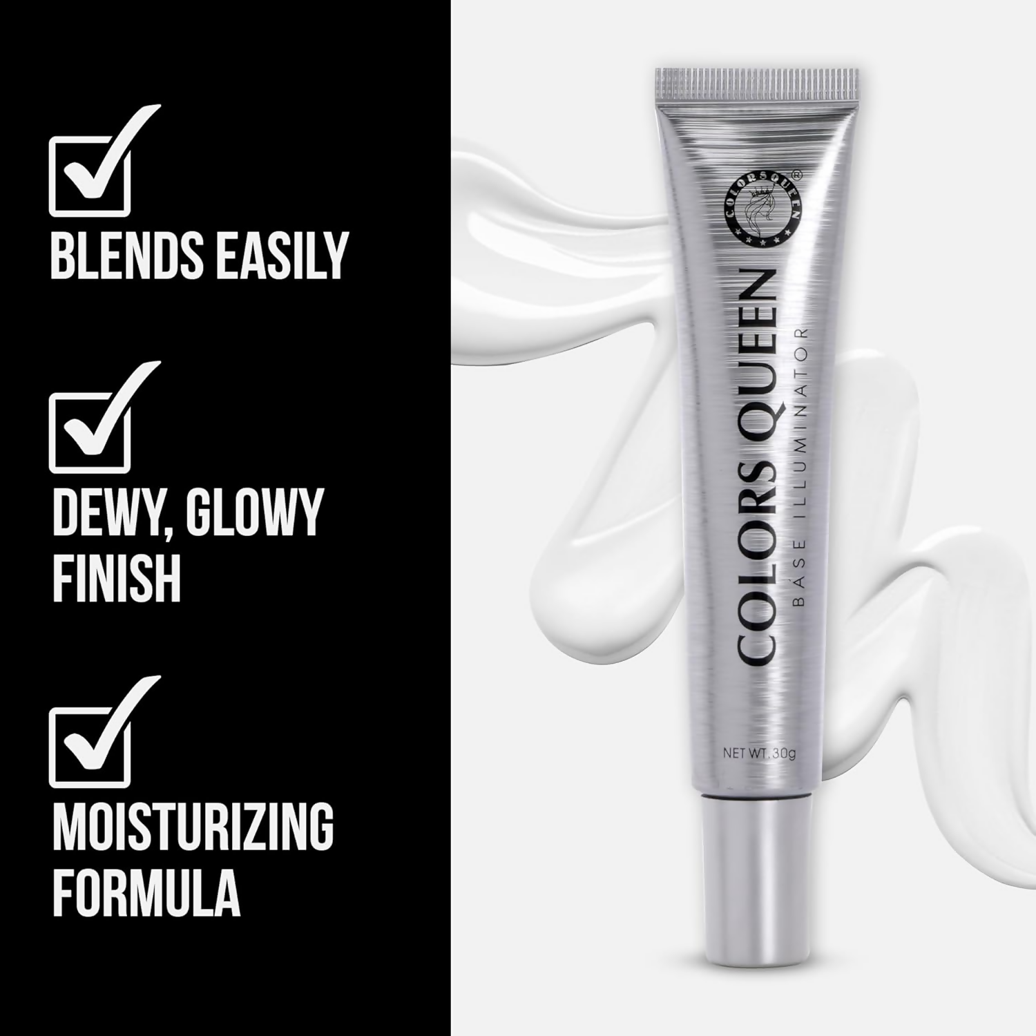 - Colors Queen Base Illuminator is a radiant addition to your beauty regimen, imparting a glowing sheen to your skin. This airy liquid highlighter for facial illumination and multifaceted illuminator is crafted to accentuate your innate beauty while offering a shining foundation for your cosmetics. Whether applied solo for a fresh and dewy effect or layered beneath foundation for enhanced luminosity, this product is your secret to achieving a youthful and glowing complexion.