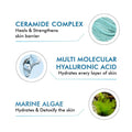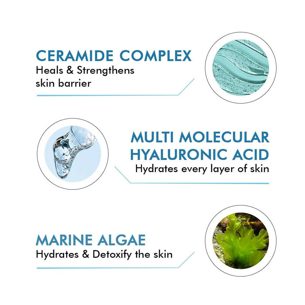 - Hydro+ is a feather-light, moisturizing serum featuring a silky, gel-like consistency, crafted with a blend of 3% multi-molecular Hyaluronic acid, Ceramide complex, and Marine Algae extract, enhancing lackluster and parched skin.