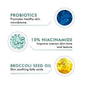 - Trubiom enhances your skin’s defense mechanisms and resilience against cellular harm. Enriched with highly nourishing Pre + Probiotics & Vitamin B3, it aids in elevating the skin’s overall condition and texture. Featuring a scientifically crafted 10% Niacinamide, it smooths and reduces the appearance of enlarged pores.
