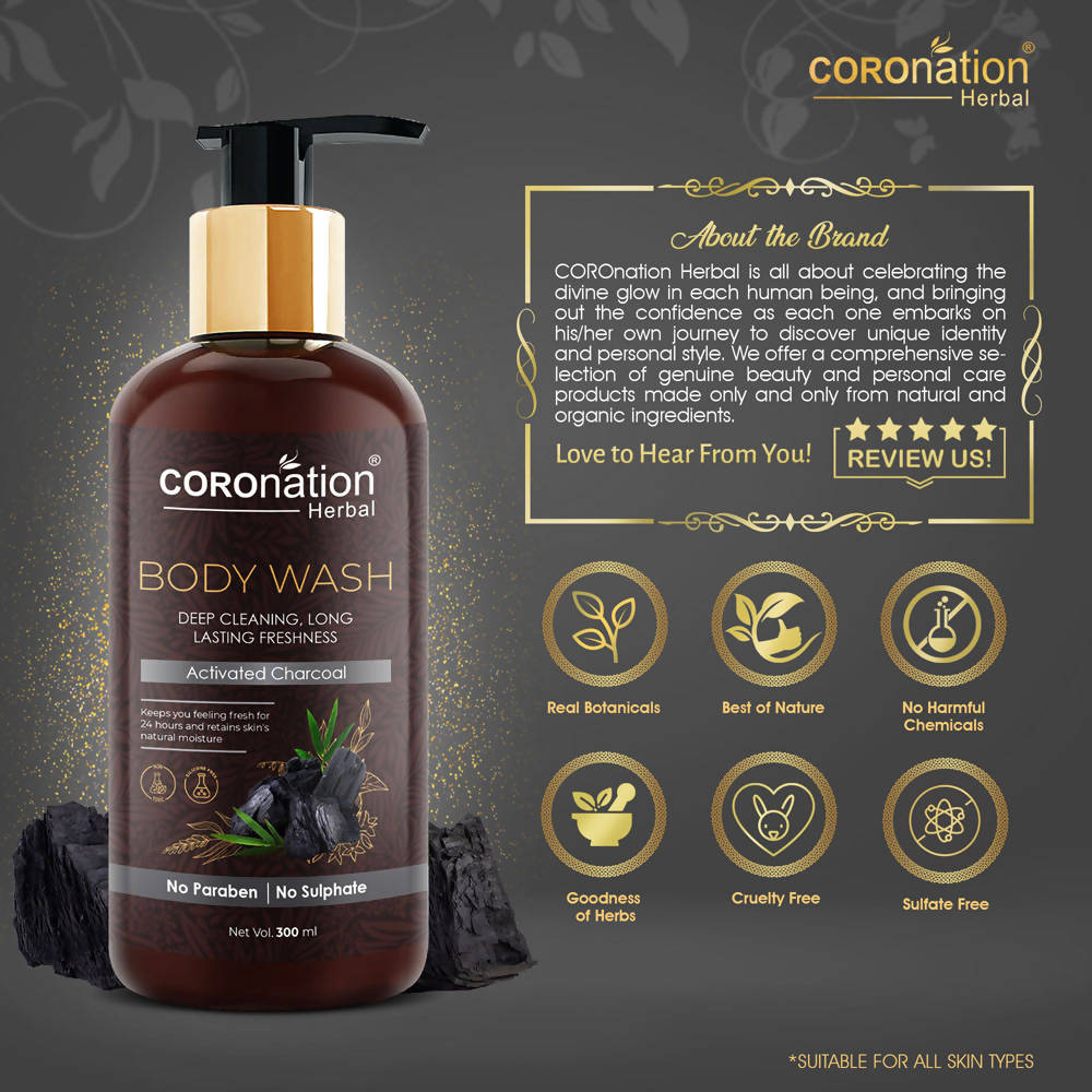 COROnation Herbal Activated Charcoal Body Wash is specially designed to thoroughly cleanse skin without drying it out, leaving it feeling fresh, clean, and revitalized. Moisturizing body wash gives you softer, smoother skin after just one shower. Activated Charcoal in this body wash draws out dirt and impurities. It leaves behind skin that is cleansed and pores that are unclogged.