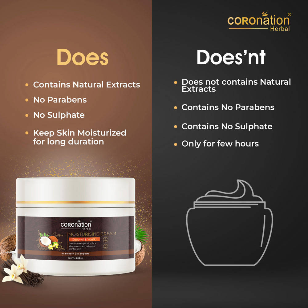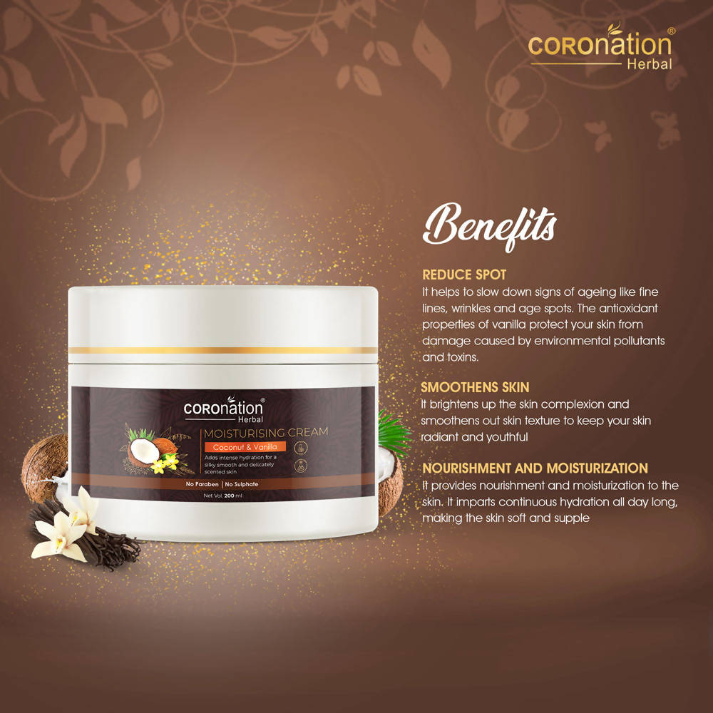 - COROnation Coconut and Vanilla Moisturising Cream for body is crafted to deliver intense hydration to dry & very dry skin, restoring a smooth & supple texture.