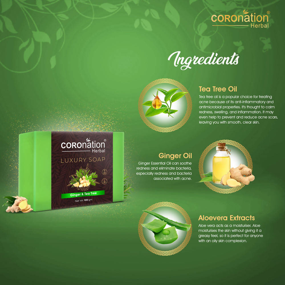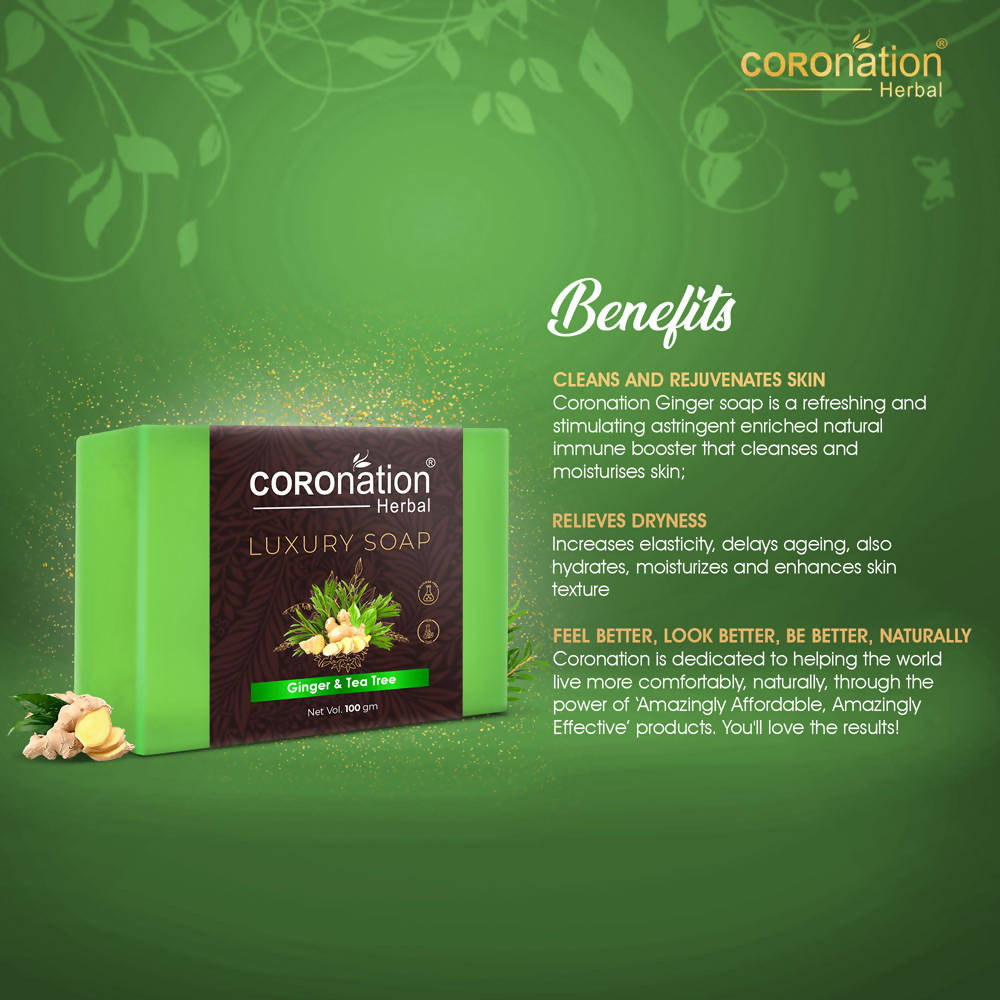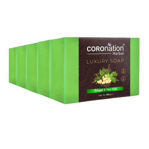 COROnation Herbal Ginger and Tea Tree Luxury soap is a gentle organic cleanser with highly effective antiseptic, antibacterial, and antifungal properties. Acts as a natural remedy for acne-prone skin and treats blemishes. It purifies the skin and absorbs excess oil for achieving clear-looking skin.