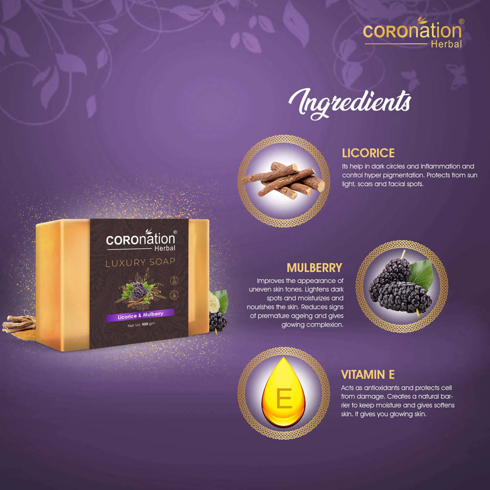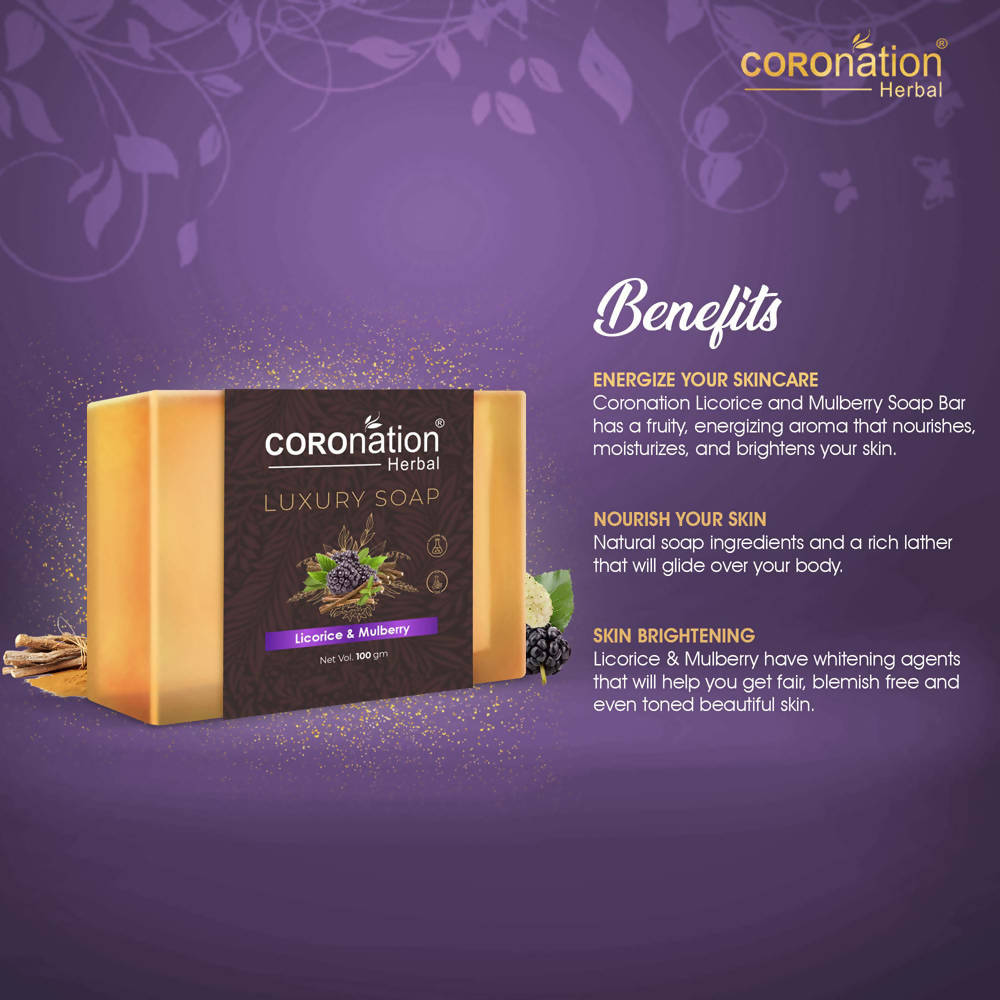 - REVITALIZE YOUR SKINCARE: COROnation Herbal Licorice and Mulberry Soap Bar boasts a fruity, invigorating scent that nourishes, hydrates, and illuminates your skin.