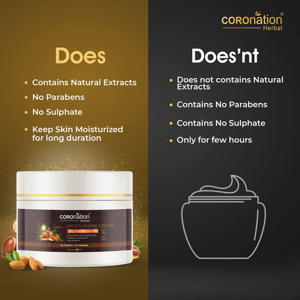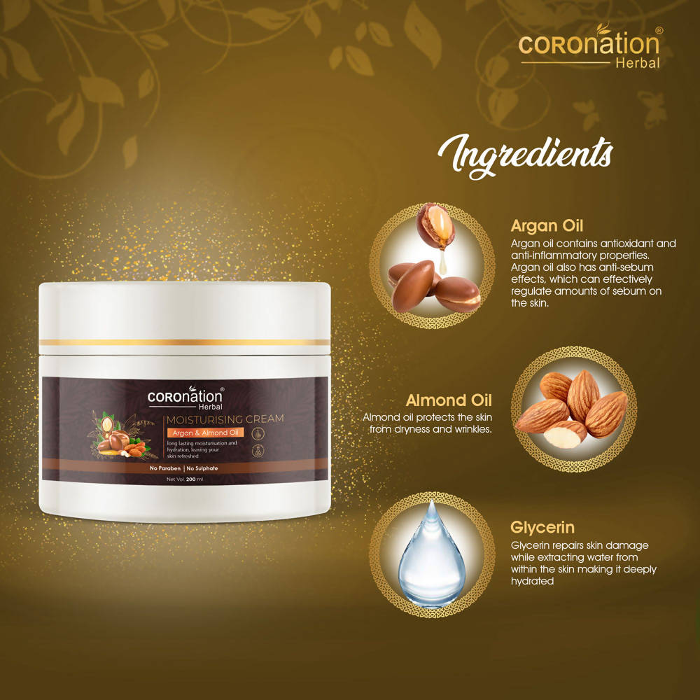 - INTENSIVE HYDRATION AND MOISTURIZATION: Coronation Argan & Almond Oil Moisturizing Cream is packed with antioxidants and nourishing elements. It is lightweight, swiftly absorbs into the skin, and provides lasting hydration throughout the day without any heaviness.
