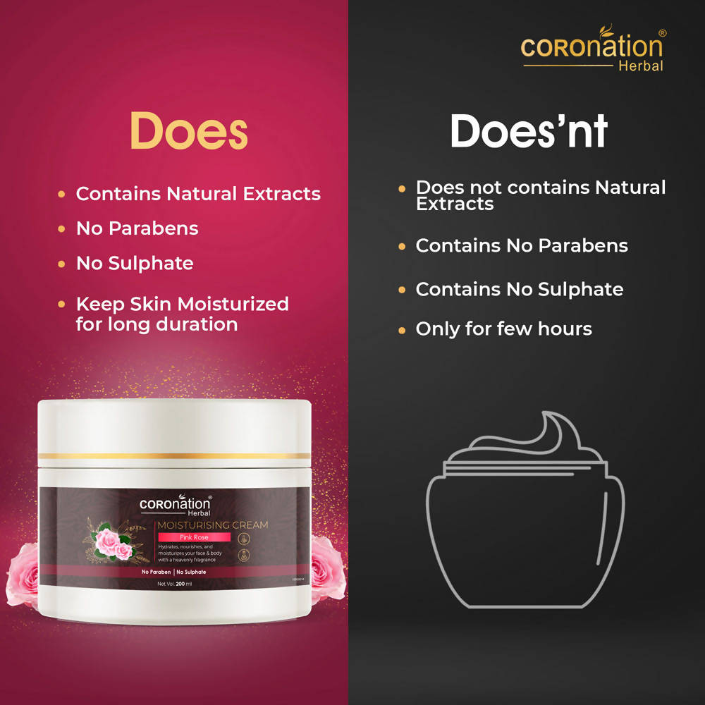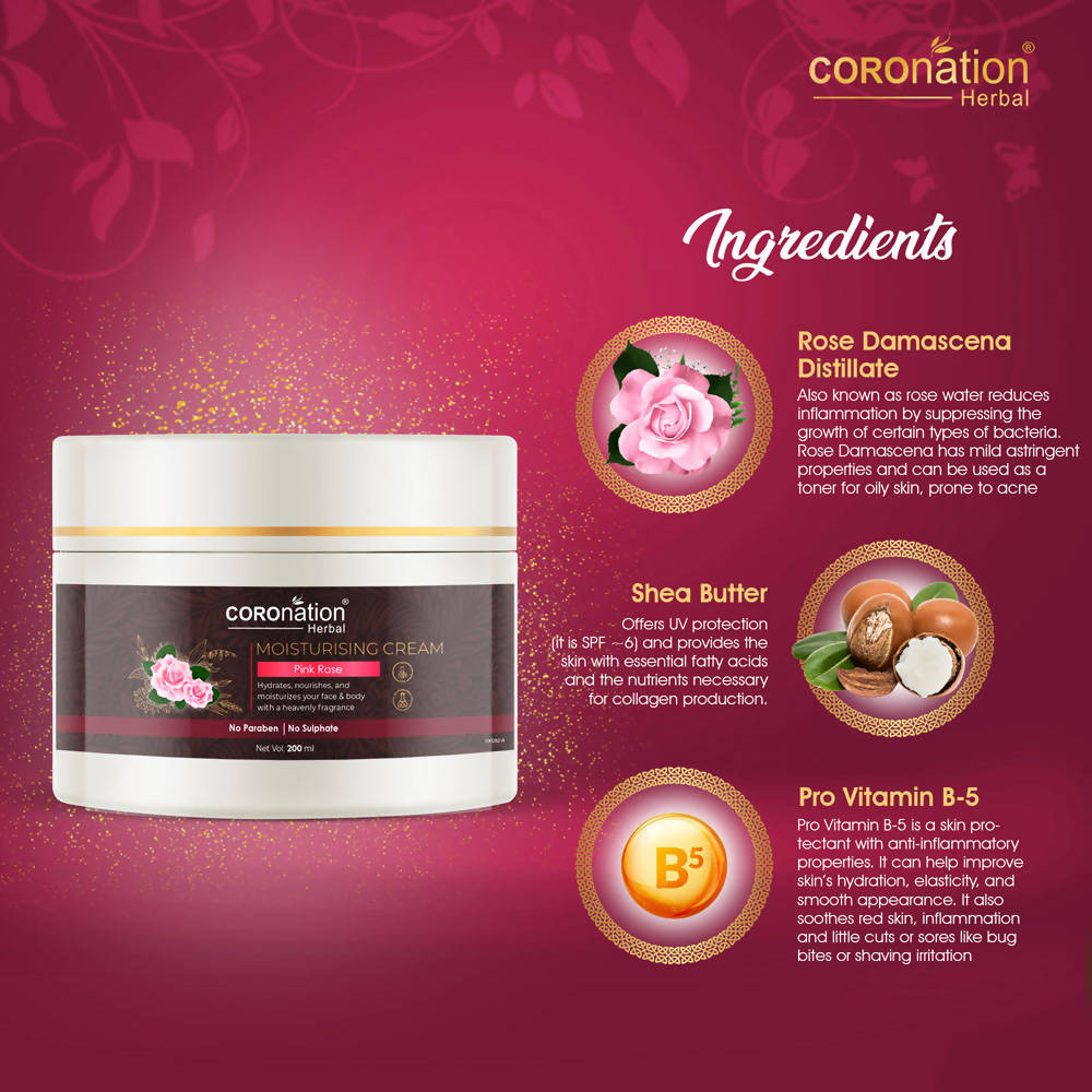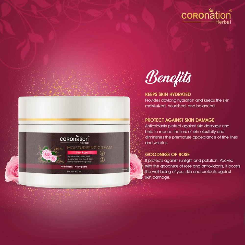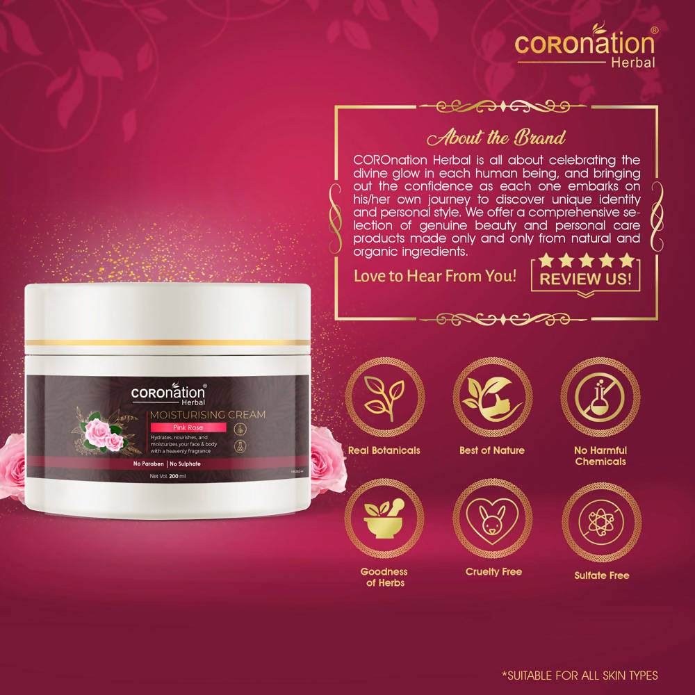 COROnation Herbal Pink Rose Moisturising Cream is a premium fragrant skincare solution designed to soften, smooth, and illuminate the skin. It enhances facial glow and radiance while diminishing blemishes and marks. It naturally hydrates, nourishes, and moisturizes your body, mitigating sun damage.
