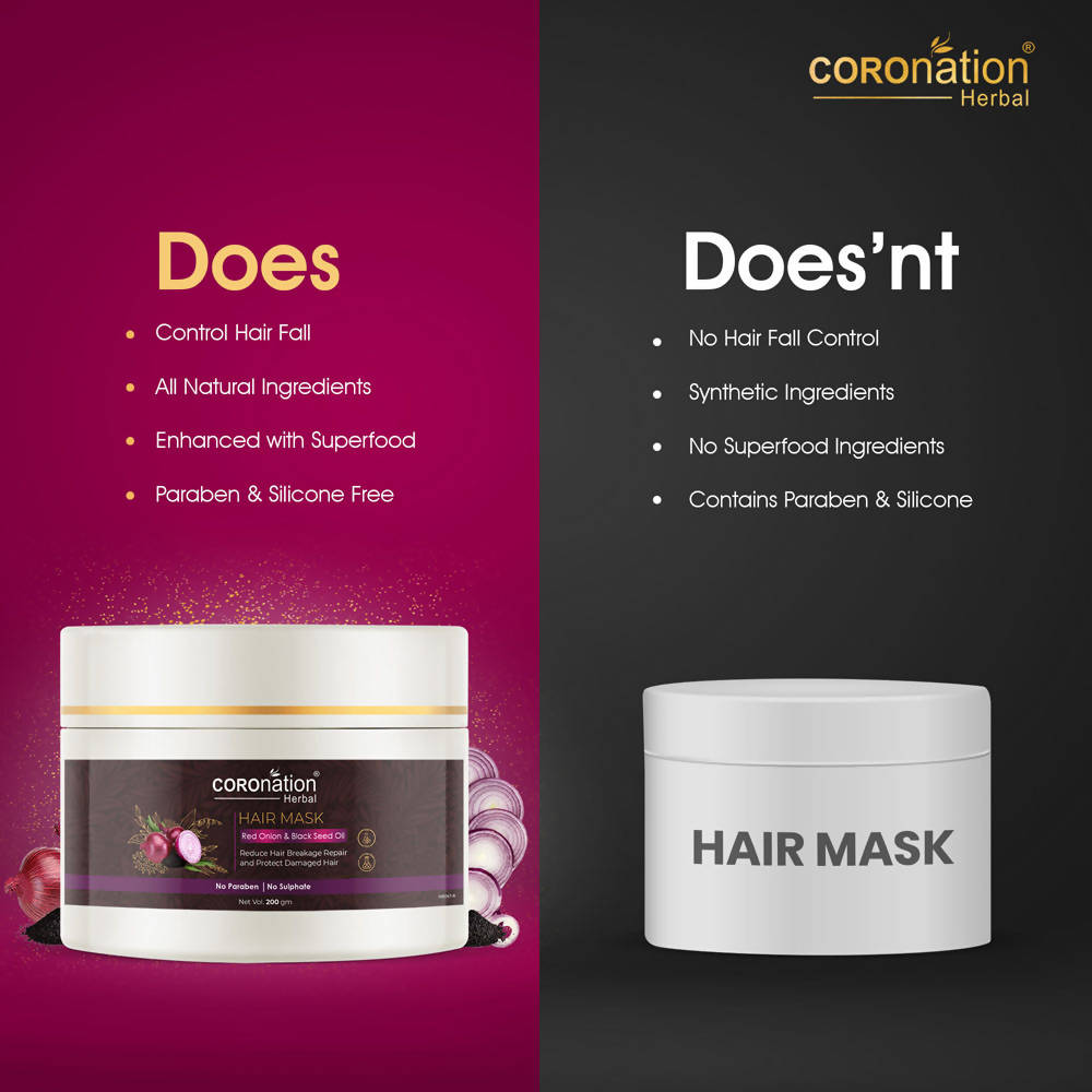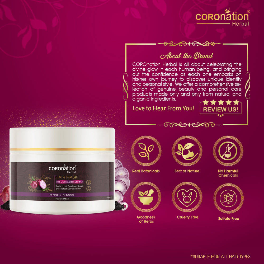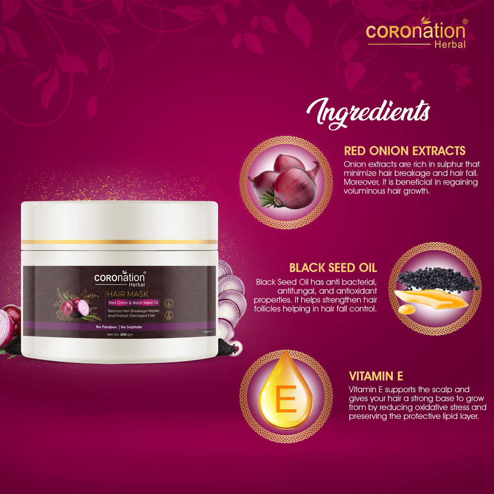 - The Coronation Red Onion & Black Seed Oil Hair Mask contains Red Onion Extracts, celebrated for their robust antioxidant properties.
