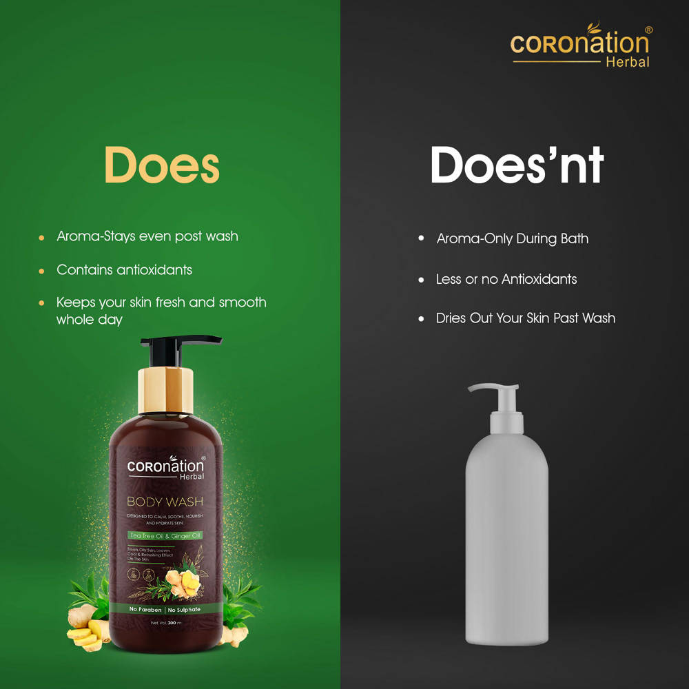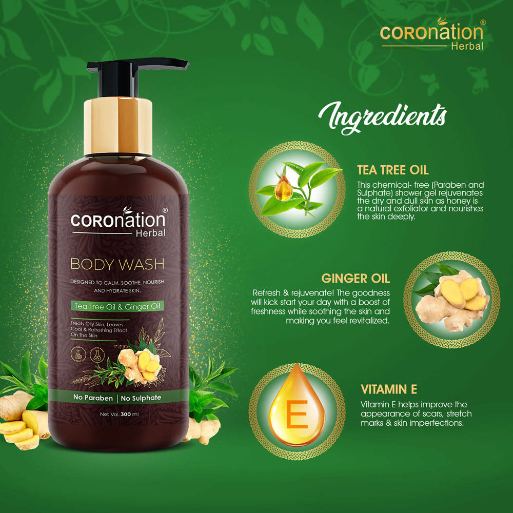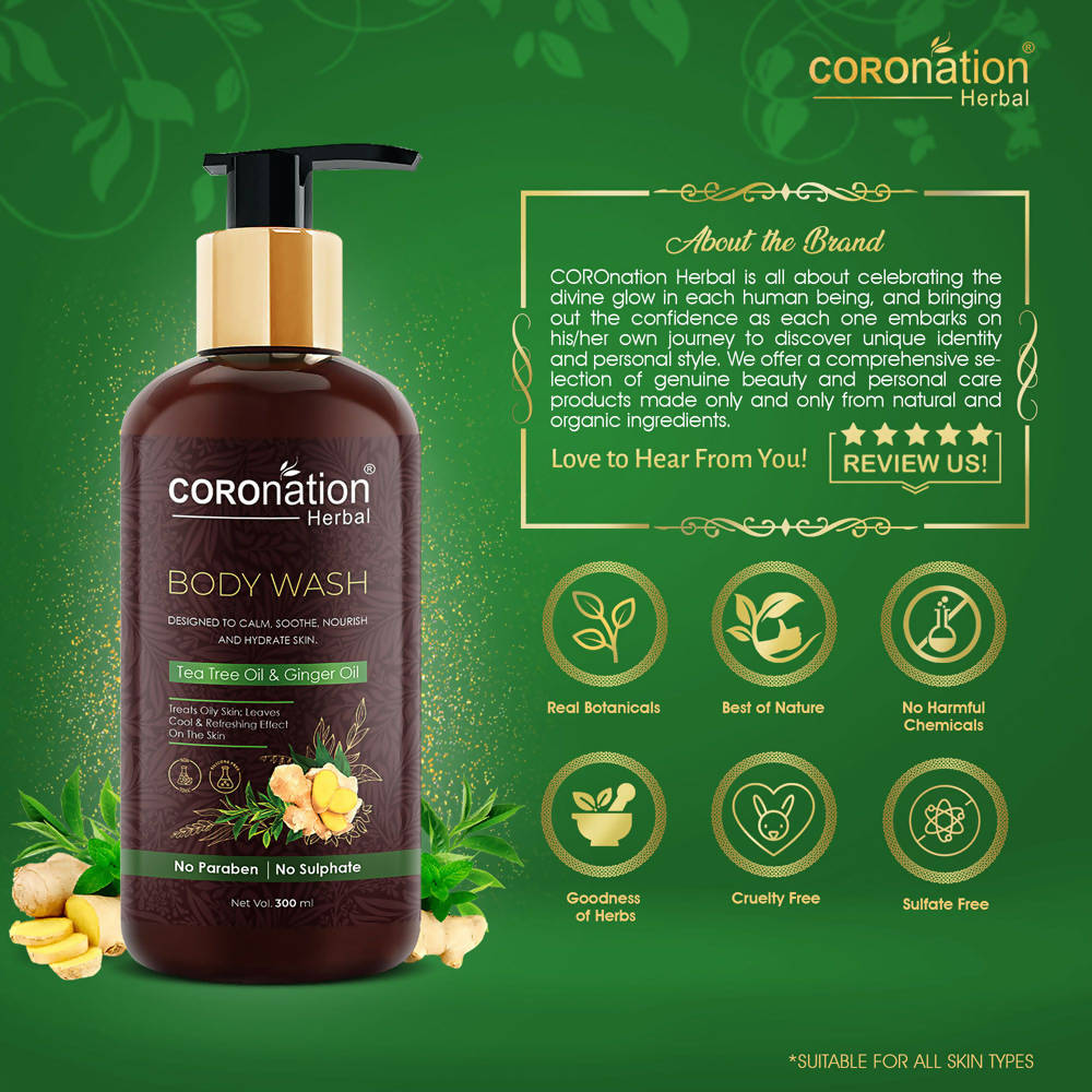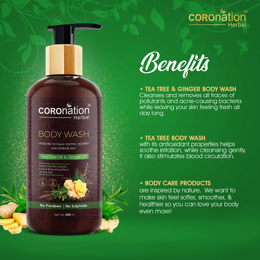 - COROnation Herbal Tea Tree & Ginger Body Wash purifies and eradicates all traces of pollutants and acne-causing bacteria, leaving your skin feeling rejuvenated throughout the day.