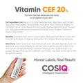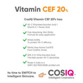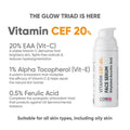 - CEF offers a dynamic blend of antioxidants, including 20% pure vitamin C (Ethylated ascorbic acid), 1% vitamin E (alpha-tocopherol), and 0.5% ferulic acid, to boost defense against environmental damage from free radicals that can accelerate aging.
