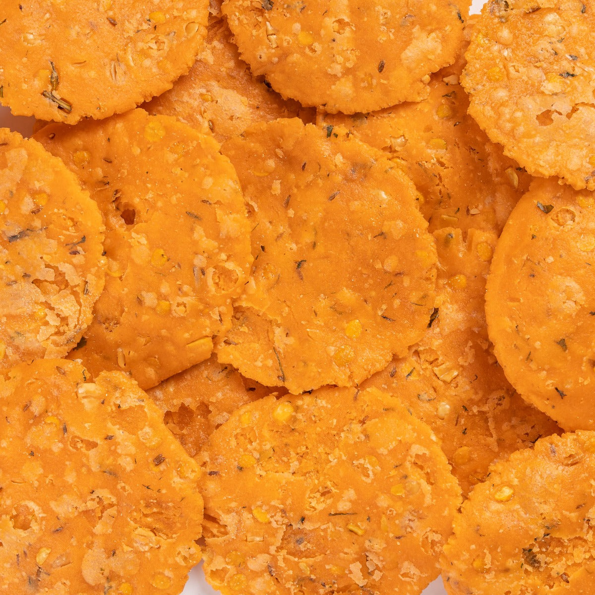Indulge in Dadu's Pappu Chakkalu, delectable Indian rice crackers that tantalize your taste buds. These savory treats pair perfectly with a steaming cup of tea or coffee. Known as Nippattu in Karnataka and Thattai in Tamil Nadu, this fried snack is a regional favorite.