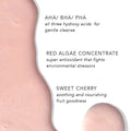 Ingredients: Aqua, Lauryl Glucoside, Coco Glucoside , Glycerin, Kaolin Clay, Vitis Vinifera (Grape) Seed Extract, Cetearyl Alcohol, Prunus Avium (Sweet Cherry) Fruit Extract, Fragaria Ananassa (Strawberry) Fruit Extract, Lactic Acid (1%), Xantham Gum, Salicylic Acid (0.5%), Saccharum Officinarum (Sugar Cane) Extract, Ocimum Sanctum (Tulsi) Leaf Extract, Sodium Benzoate, Potassium Sorbate, Glycolic Acid (0.2%), Tocopherol Acetate (Vitamin E), Glucanolactone, Citric Acid (pH balancer), Astaxanthin.