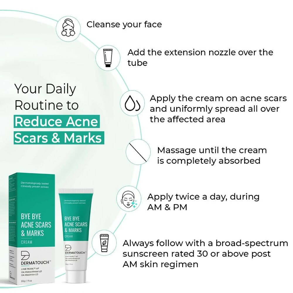 - Dermatouch Bye Bye Acne Scars & Marks cream is enhanced with scientifically validated ingredients that effectively diminish acne scars and enhance overall skin texture. It softly exfoliates dead skin while promoting accelerated skin regeneration and cell renewal.