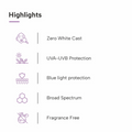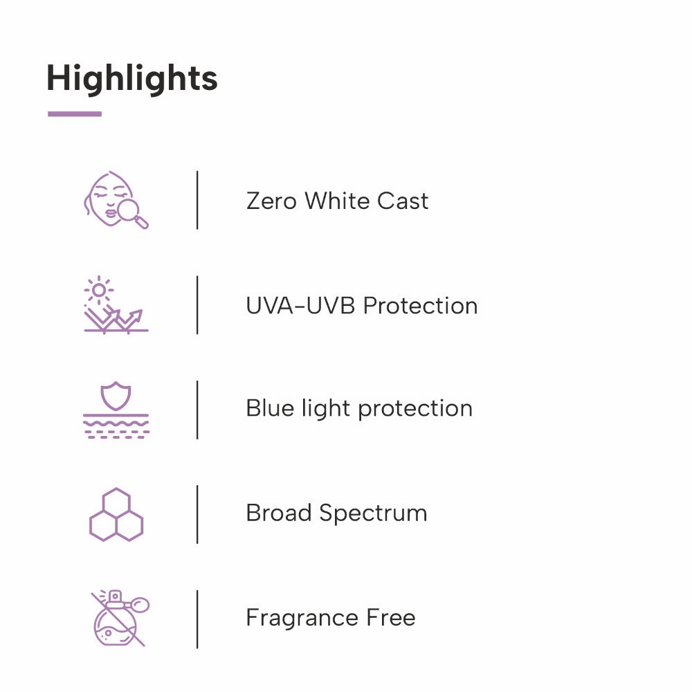 - Quick absorption: This sunscreen absorbs rapidly, providing intense hydration without any white cast. Its quick absorption attribute contributes to its lightweight feel.