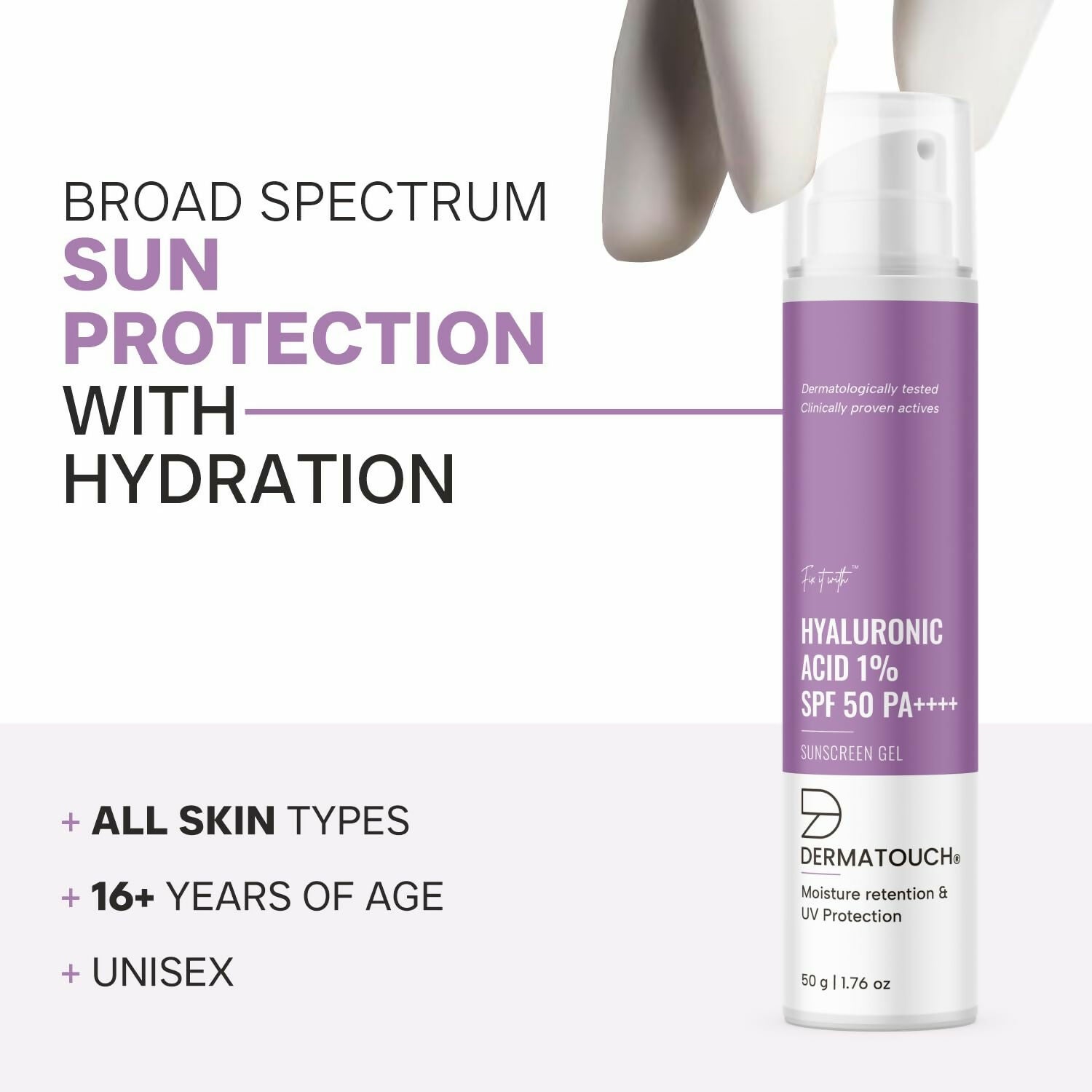 - NO WHITE CAST: Dermatouch HA 1% Sunscreen is a non-sticky gel cream that seamlessly blends into the skin, leaving no white residue.