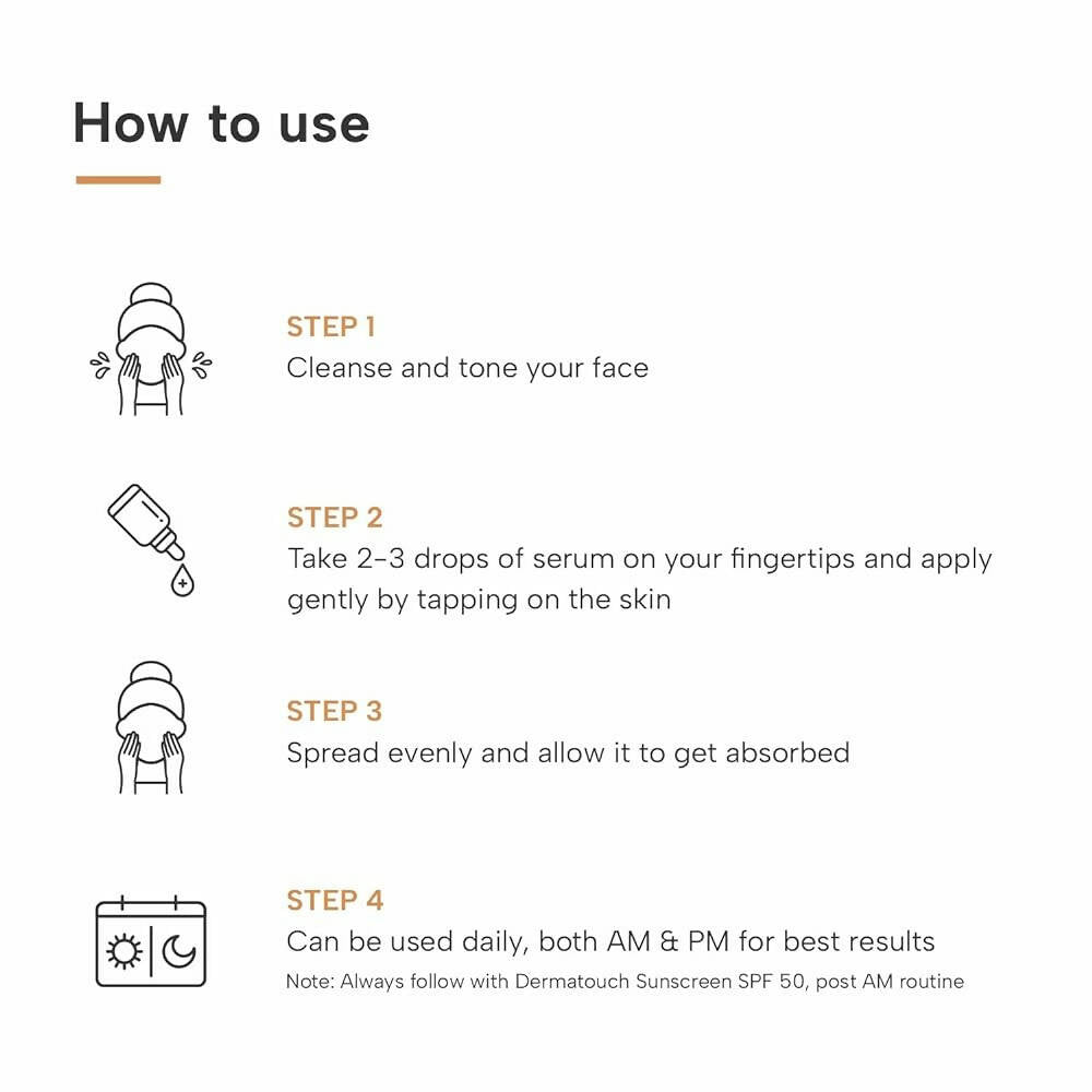 - Cleanse and tone your face • Dispense 2-3 drops of the serum onto your fingertips and gently tap onto the skin • Distribute evenly and allow the serum to absorb • Suitable for daily use, both morning and night, for optimal results Note: Always follow with Dermatouch Sunscreen SPF 50 after your morning routine