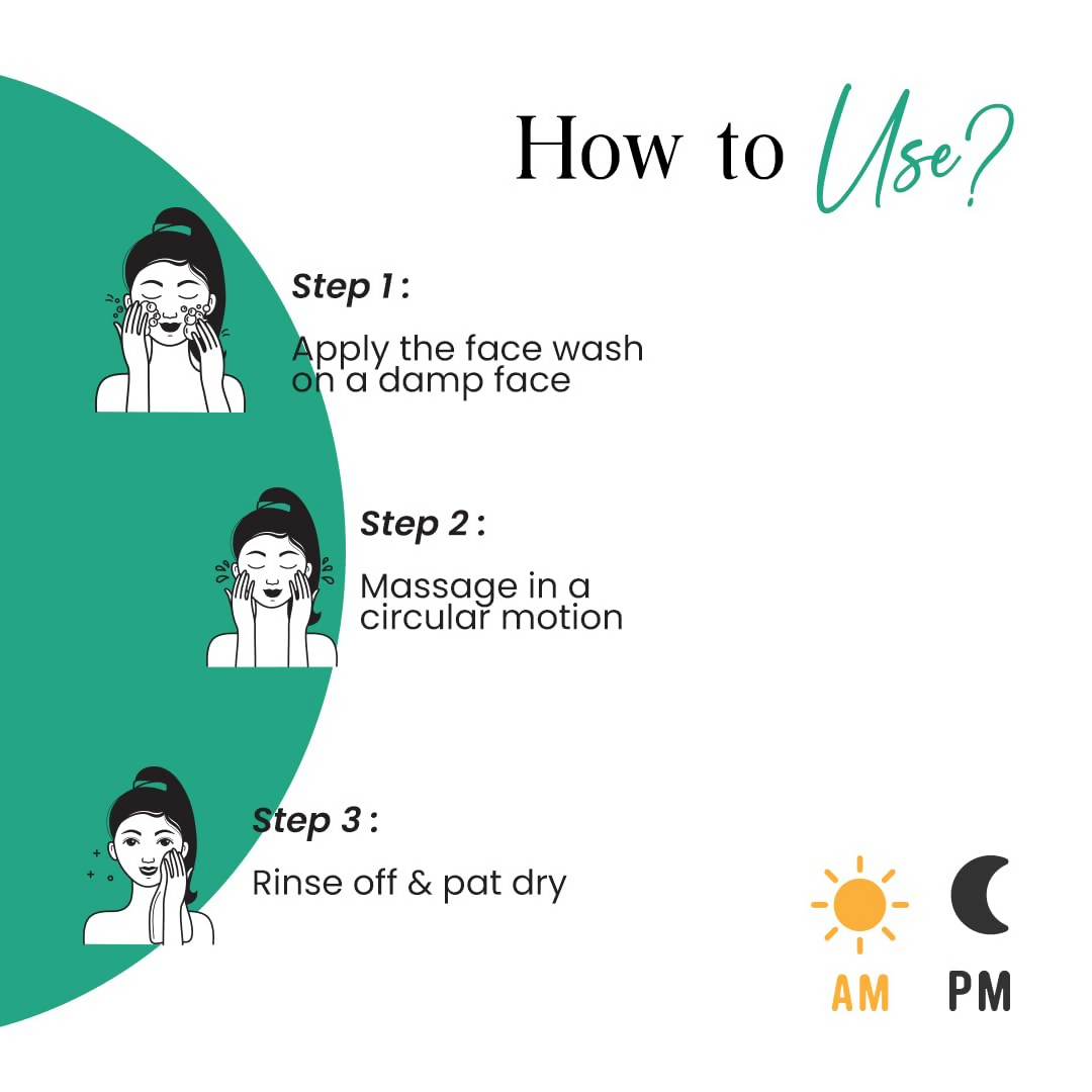 - Moisten face with regular water. Take a small amount and gently lather on the face. Cleanse in upward, circular motions & rinse off. Use twice daily.